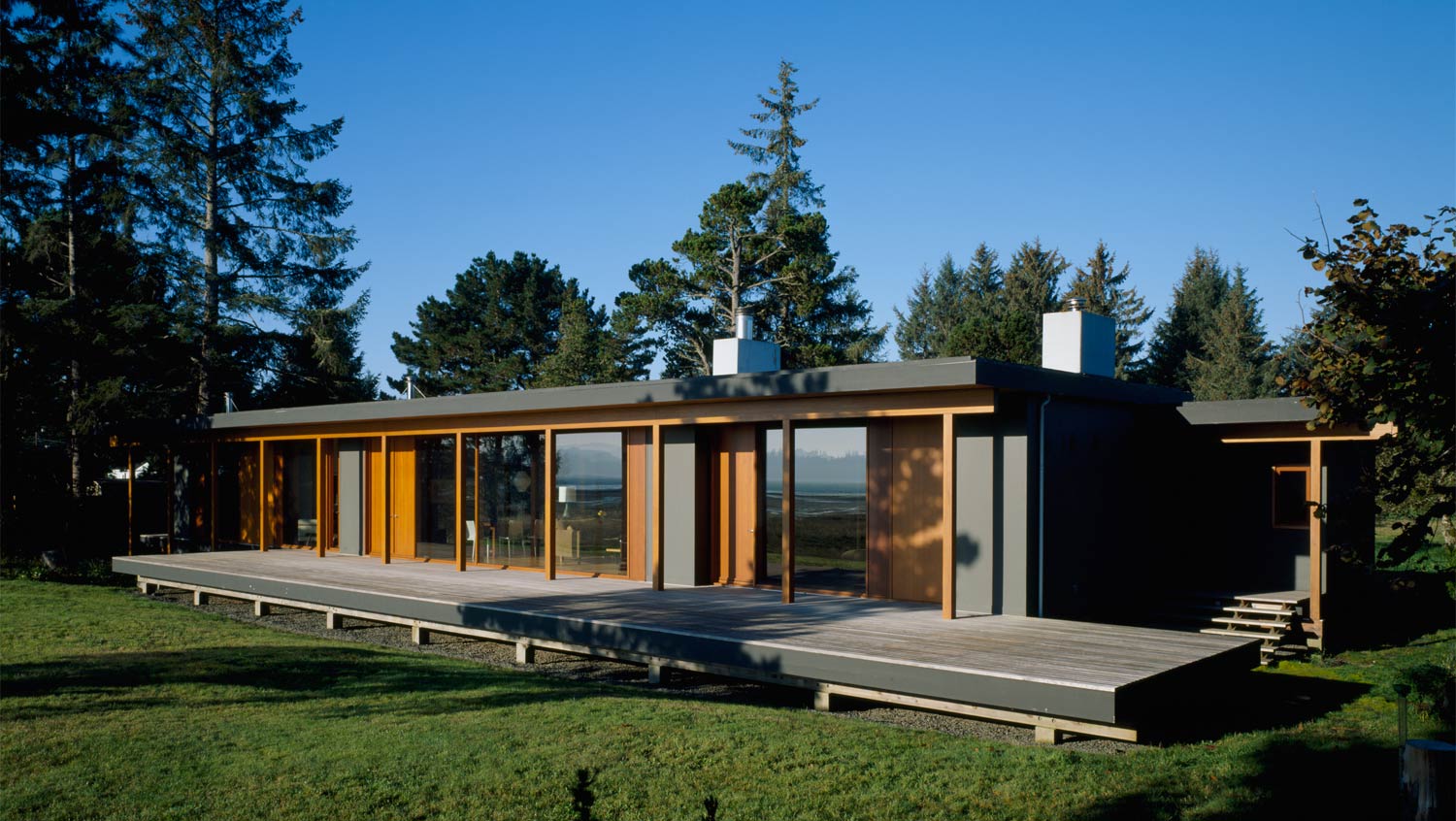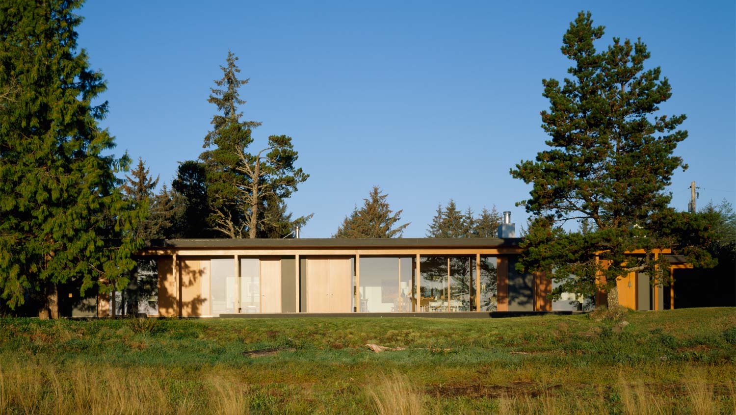 The Bay House was commissioned by a museum director and her partner, an accomplished photographer. The house marked a return to the Pacific Northwest, first as a summer home and later as a permanent residence. Shielded by a grove of fir trees, the property is on the remote Long Beach Peninsula in Washington, looking east to Willapa Bay. As a home and creative workspace, the house unites distinct areas for living and work, and connects them back to the land and water.