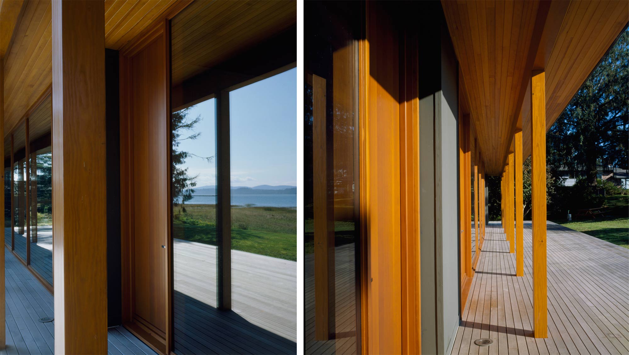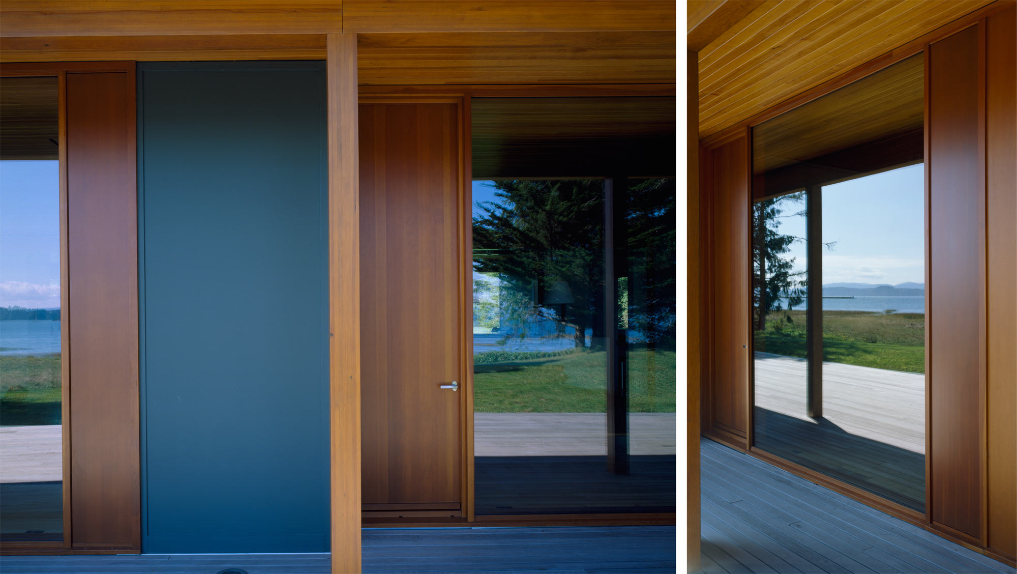 Poised on the edge of the bay shore wetlands, the house touches the ground lightly, and is arranged as three elevated wood platforms supported by structural timber. Deeply overhanging roofs mirror the house’s organization and offer protection from the persistent coastal rain. On the first, a workspace, photography studio and garage serve as the gateway to the site. From this point, a raised boardwalk traverses a sheltered garden and leads to the main house. An entry foyer and open kitchen are located on the second platform. On the third, a suite of bedrooms and living spaces open to the water’s edge and are united by a broad terrace facing the bay.