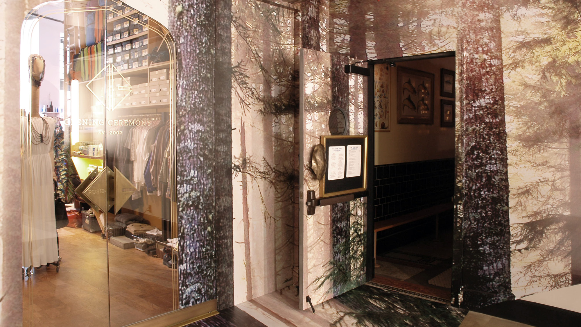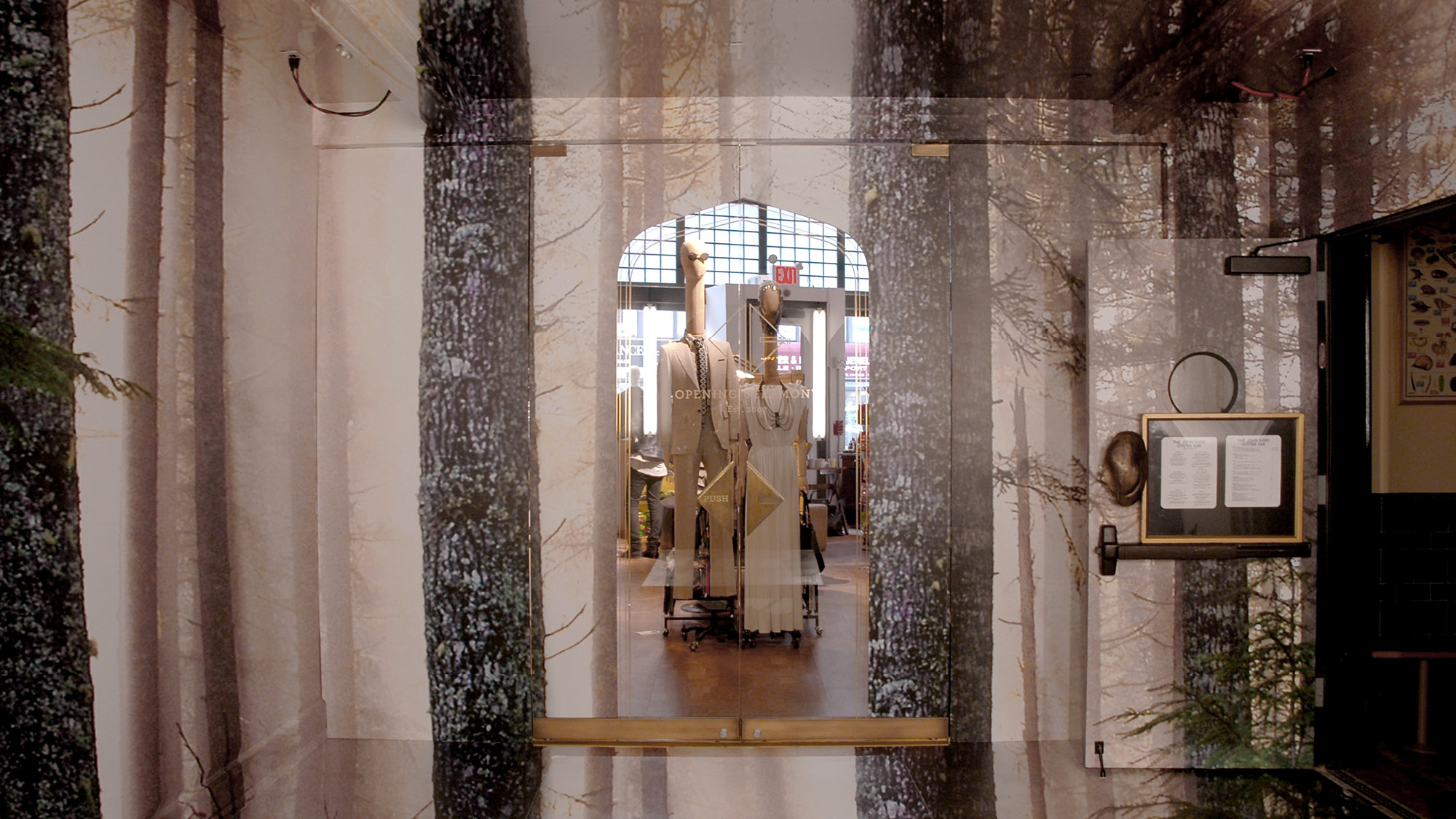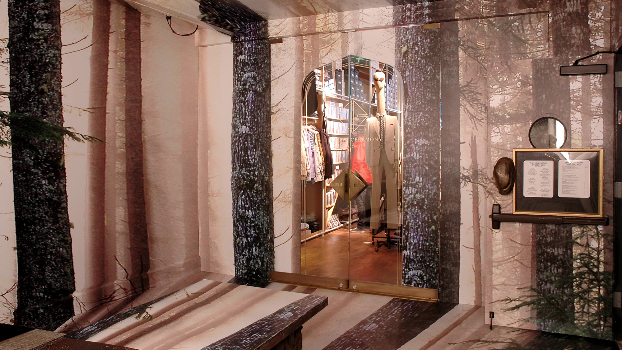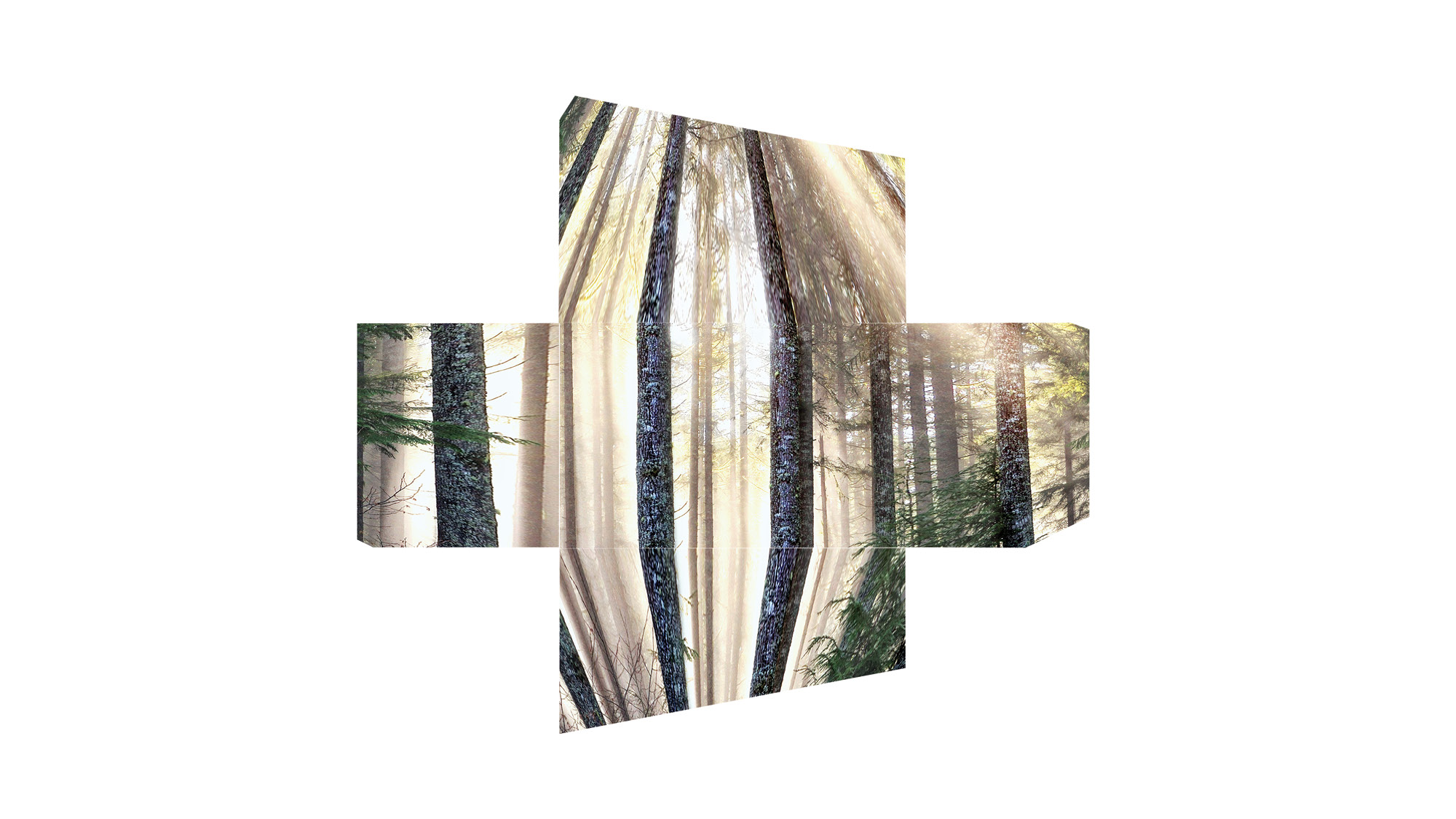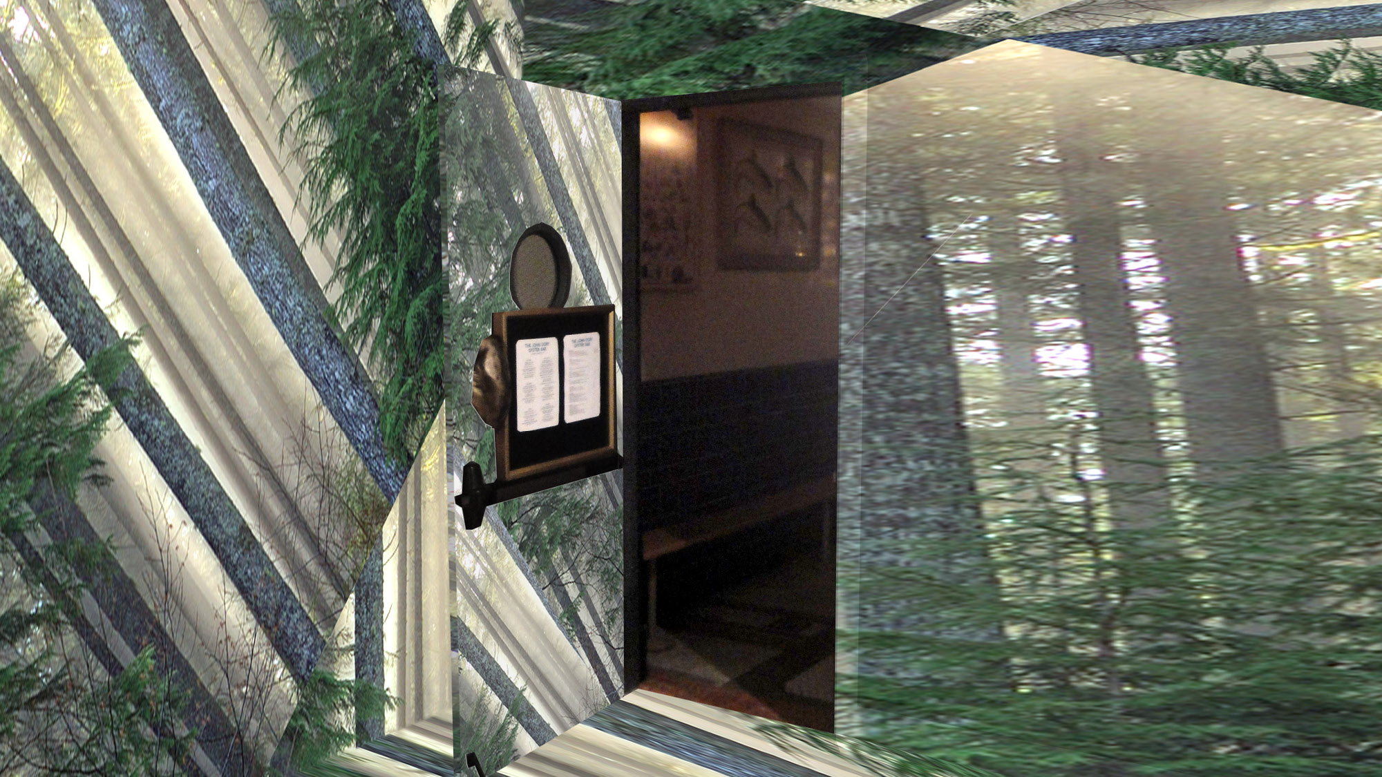 “Forest for the Trees” plays with perception, dislocation and distortion through one simple move: a continuous and carefully installed image, spanning walls, ceiling, moldings and floors as well as table and door surfaces, to create—from a certain approach—a sense of total immersion in a forest of monumental Douglas-fir. For an instant, the sense of urban compression, the in-between-ness of stacked floors, drops away. From other vantage points, the image appears as a warped space or pure abstraction, inviting the viewer to wander and seek the point of resolution.