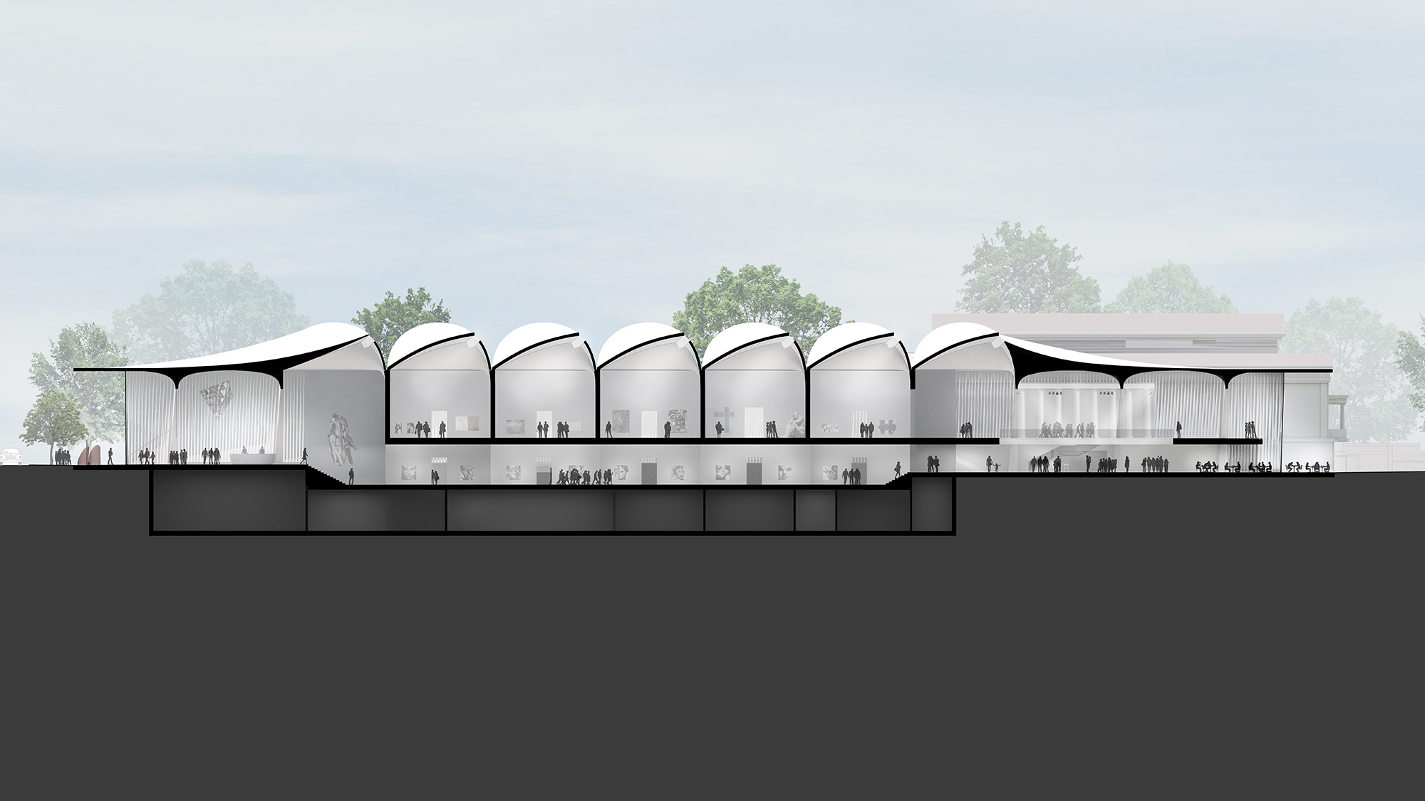 The proposal is an invitation: creating a bridge between the historic buildings and the city, a new entry for the museum, new gathering spaces, and an armature for connecting expansive light-filled galleries to a new sculpture park.