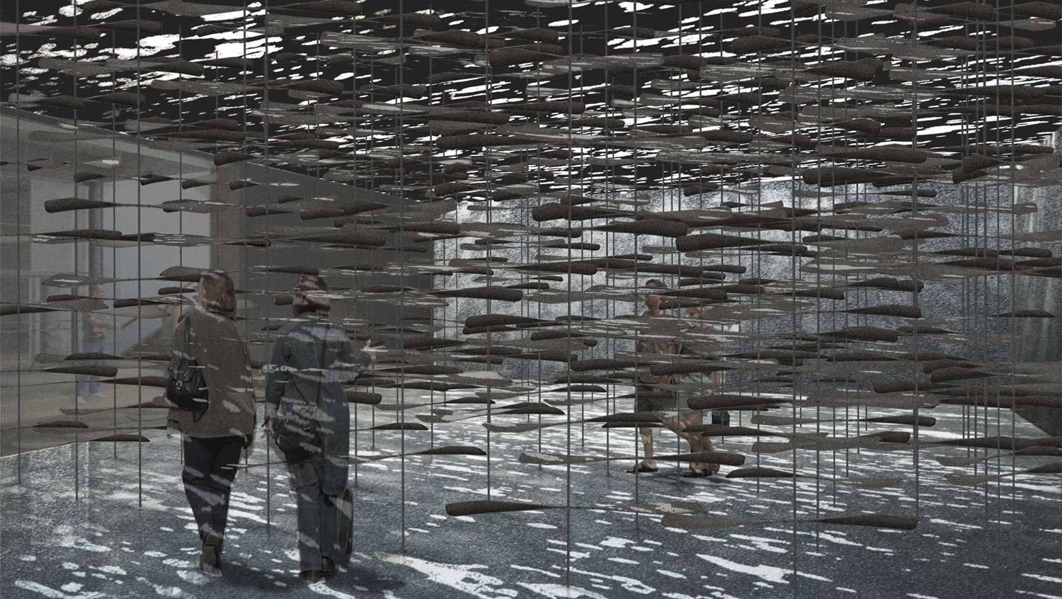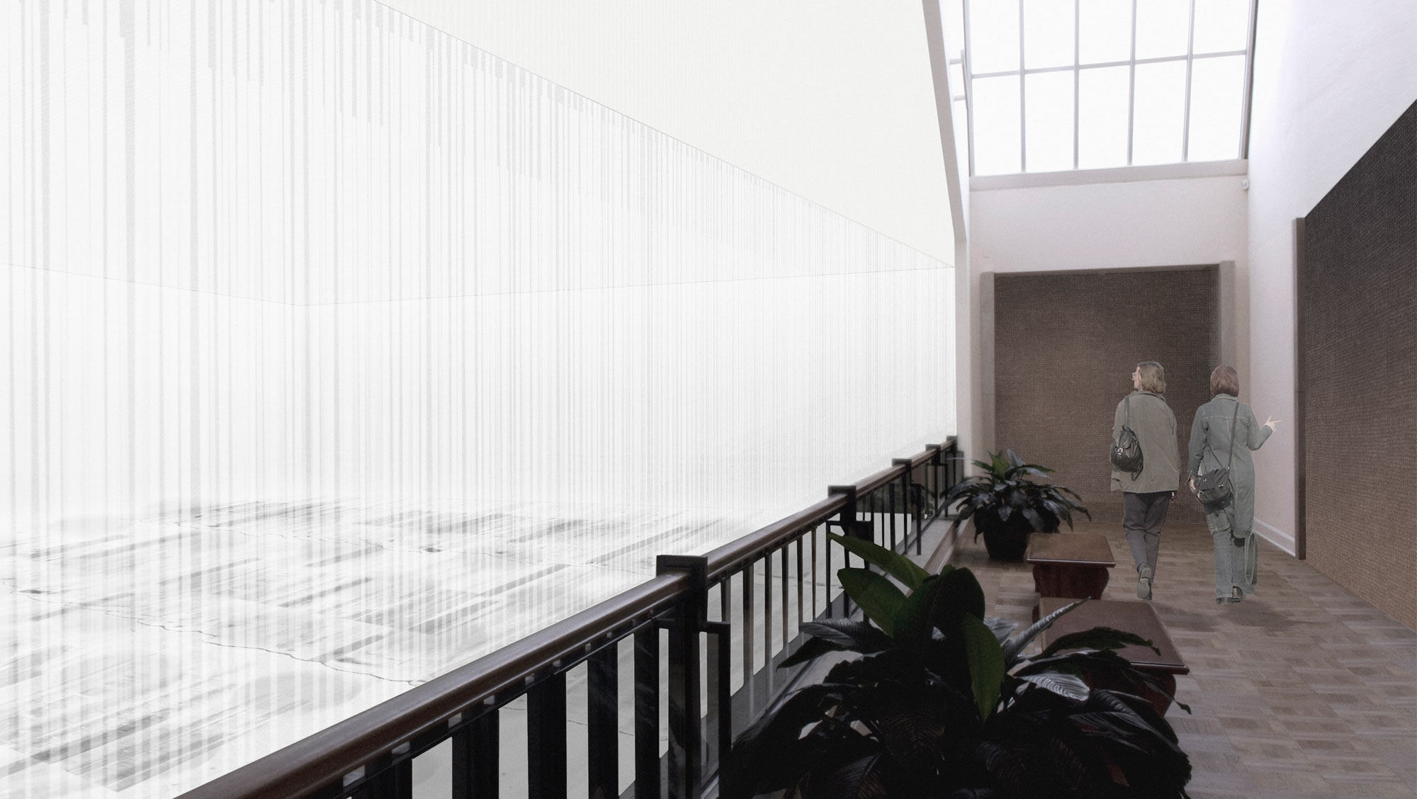 The court is bisected between the first and second levels, creating distinct yet interconnected realms. On the lower level, one enters a field of black and grey interrupted by shards of light. The space is filled with a rush of wind from fans concealed in the shadows. The space is destabilizing, a darkness with weight and mass. Viewed from the adjacent galleries, the upper realm is defined by brilliant, sourceless light—white hot, with only the ambiguous hum of distant transformers, traffic, industry. It is a light that removes all reference — filled with light and sound yet empty and unoccupiable. Both spaces explore an absence, a sense of isolation and boundlessness. Together, they evoke the memory and physicality of the Gorge, and summon the powerful forces that continue to transform this iconic landscape.