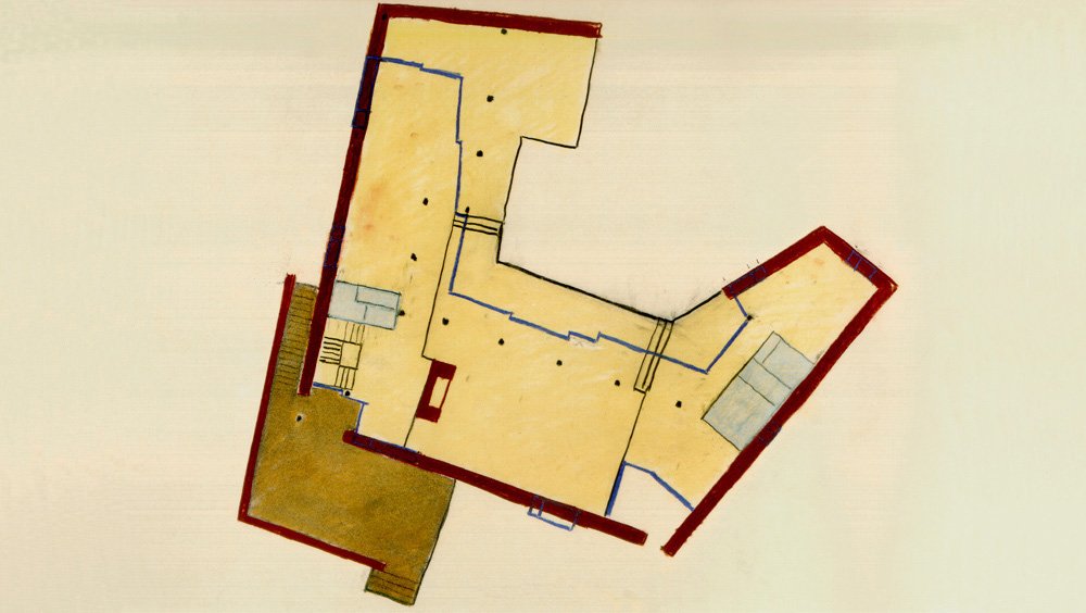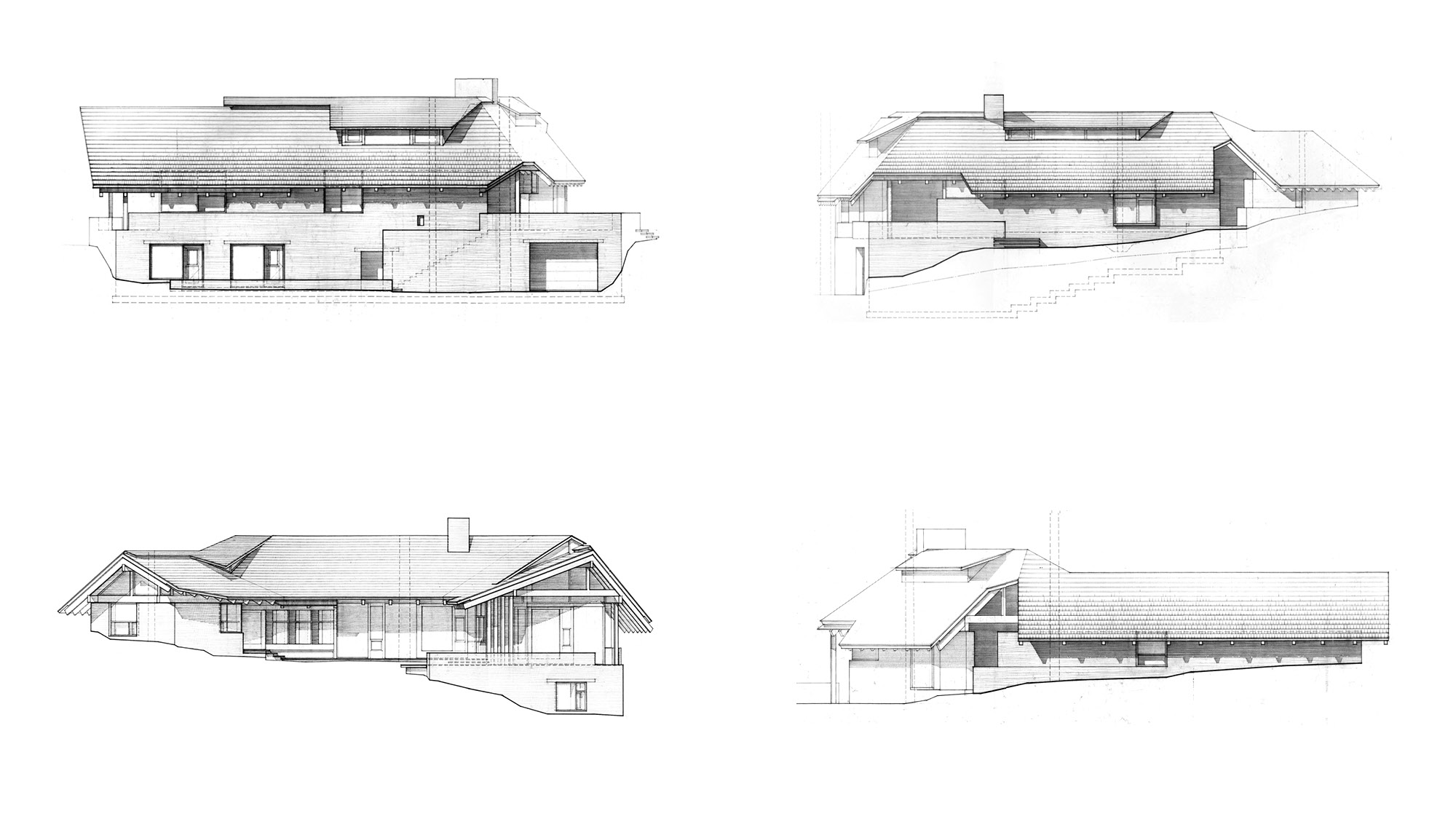 The house is set upon a steep and heavily wooded slope on the lake’s north shore. It utilizes and interprets vernacular forms and materials, giving it a sense of monumentality and timelessness. The house is organized as three monumental volcanic stone walls that surround a heavy timber frame of reclaimed Douglas-fir. The frame supports a deeply overhanging roof of cedar to offer protection from heavy snowfalls. A guest suite and utility level below the main floor and a two-bedroom loft accommodate both family stays and additional visitors. The main body of the house — open kitchen and dining areas, living room, office and master suite— surrounds a three-sided courtyard that opens to the south and centers upon the landscape, framing views to the lake and mountains beyond.