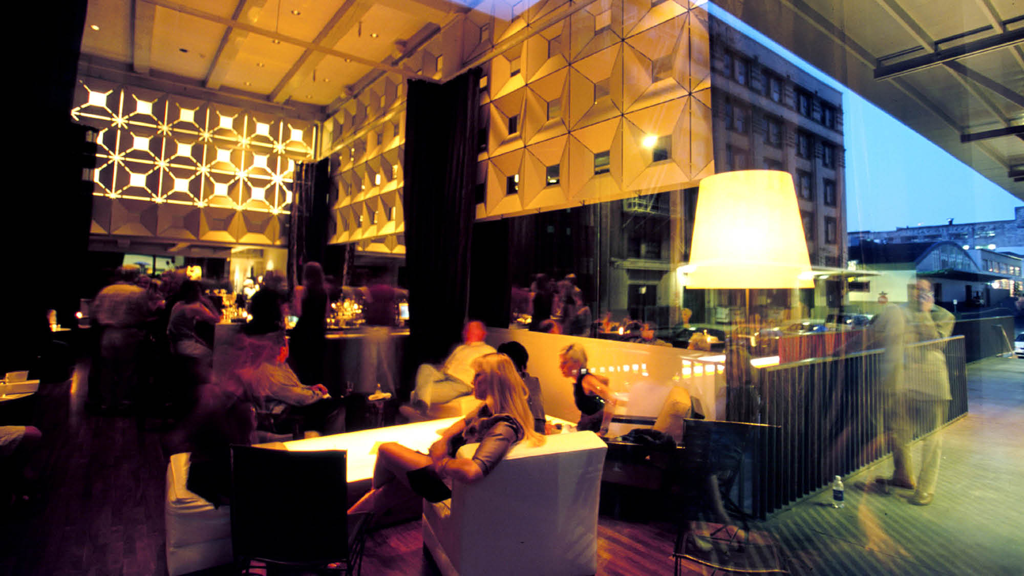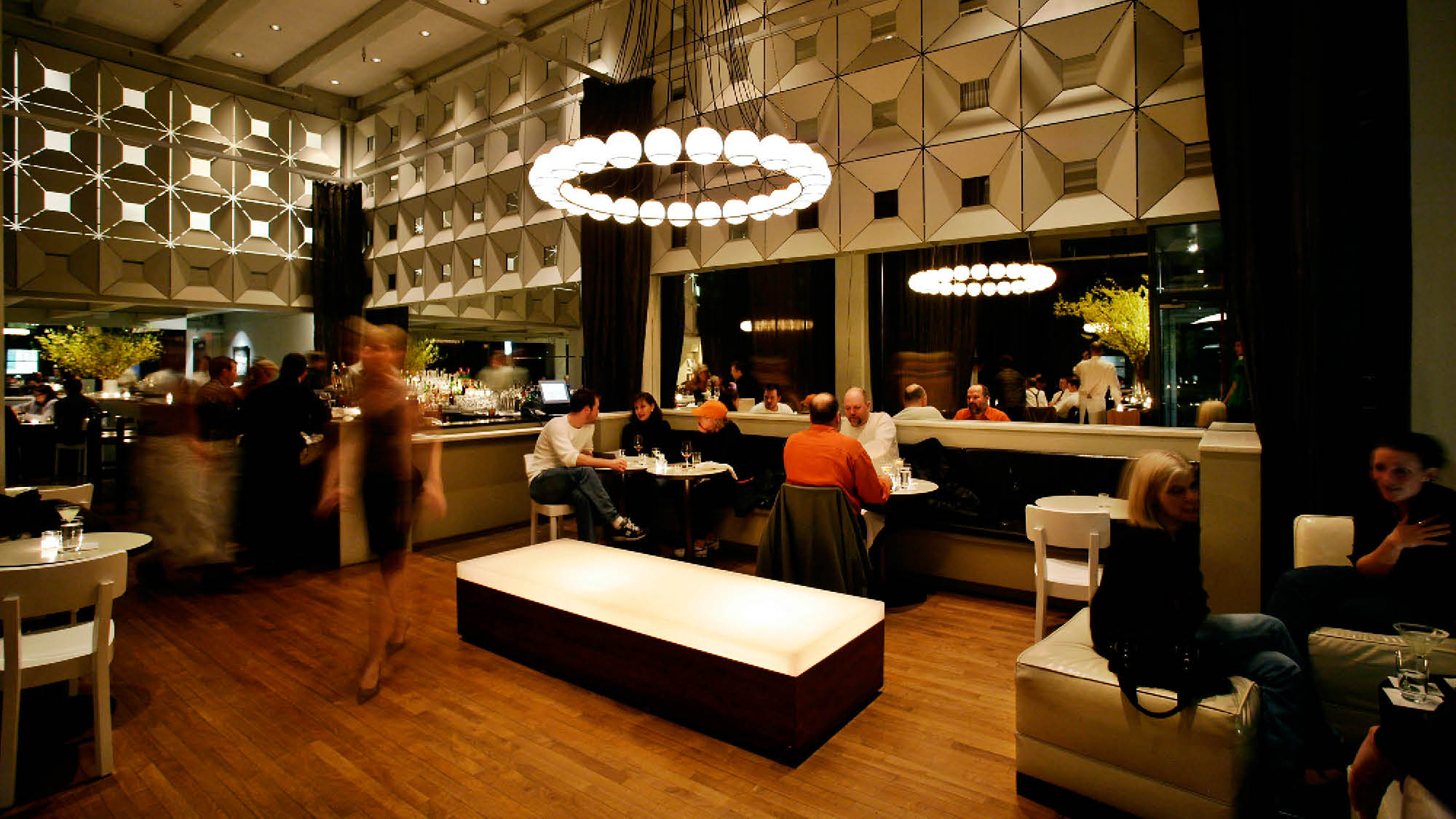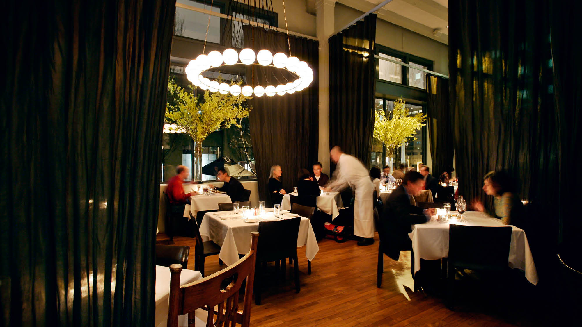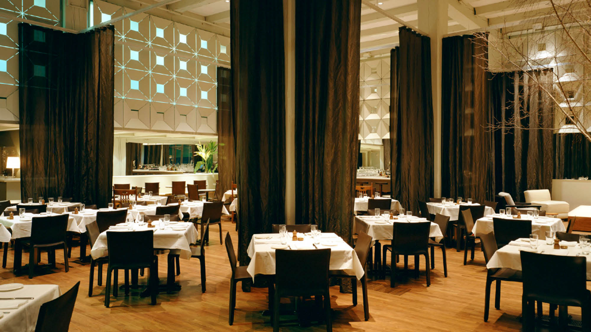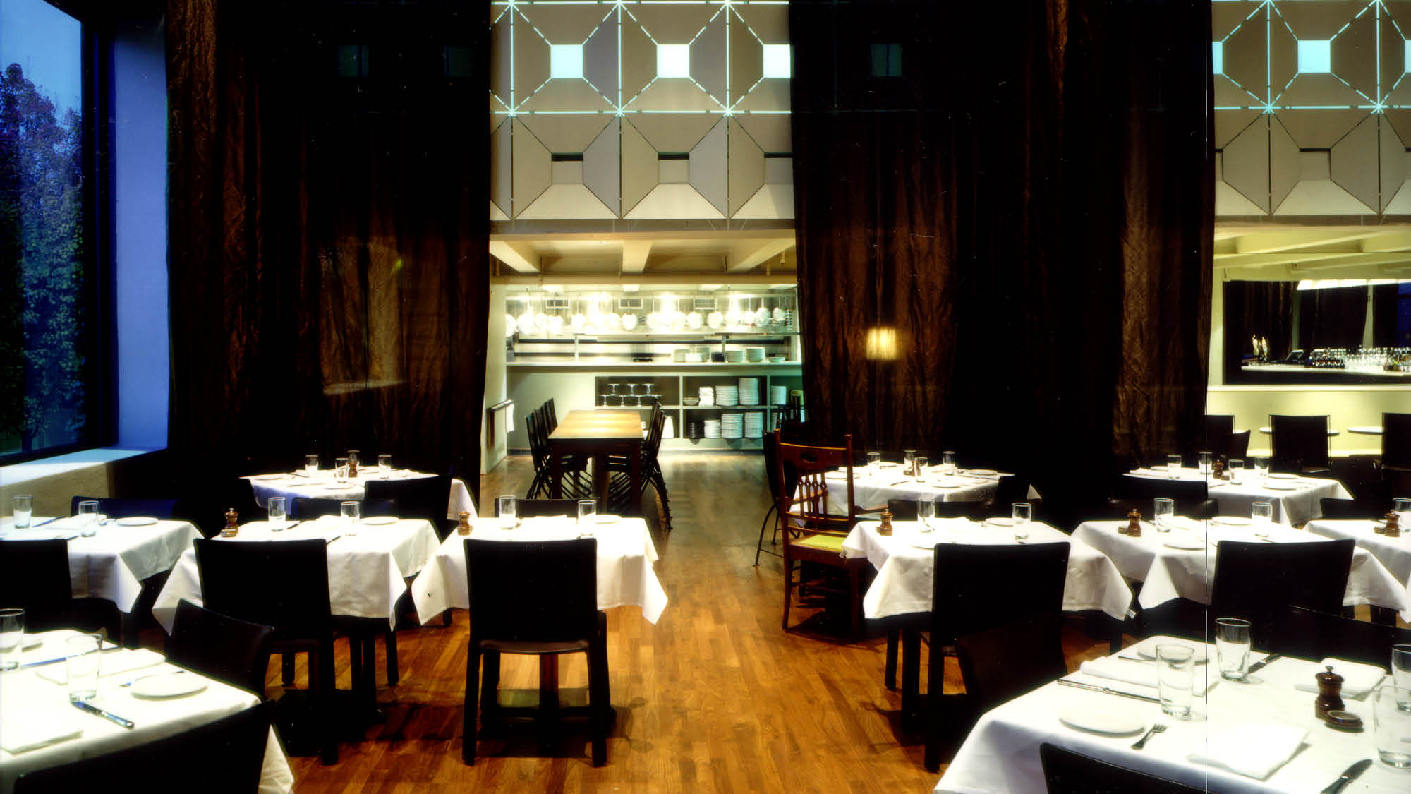 Bluehour deftly balances the intimate with the spacious. Café tables on the terrace and expanses of glass on the corner site ensure that Bluehour feels like an extension of its environment; within, mirrored panels in white-painted, beveled frames brighten the deep interior spaces. A simple pairing of pale and luminous surfaces with deeply-stained wood unify the 80' x 100' space and harmonize with the building's heavy timber frame. A grid of custom, 12' high translucent curtains create opportunities to scale the space, soften the industrial edges and offer varying degrees of privacy and opportunities to reconfigure for private events.