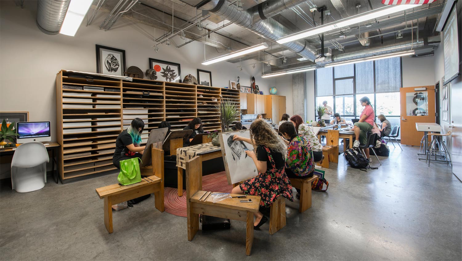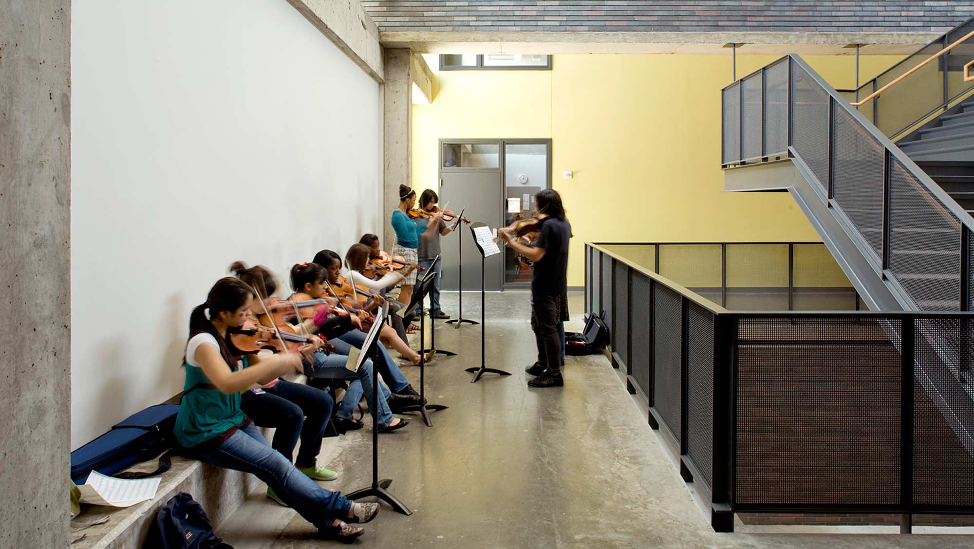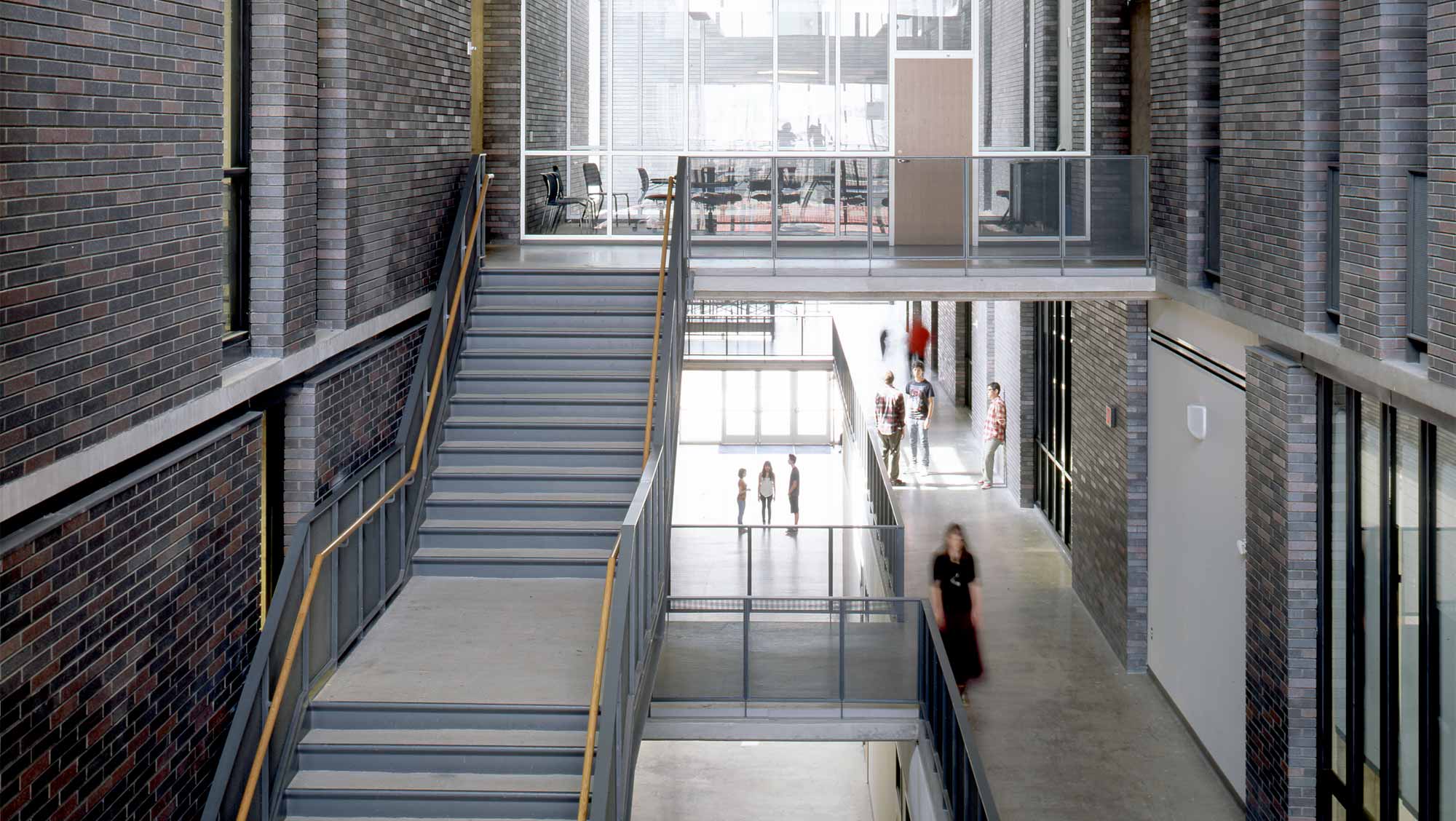 Located within the Dallas Arts District, the school manifests the qualities of creative industry: the brick and concrete structure is elemental, the space raw and open. The building is urban and condensed: four stories of workshops, classrooms and studios frame an outdoor amphitheater at the heart of the school. Each program maintains its own identity and resources, and is connected by a network of multi-story interior streets. The corridors are filled with art and energy; the common spaces encourage performance and informal interaction. At the same time, the building also provides quiet spaces for student to study, practice and refine their creative voice.