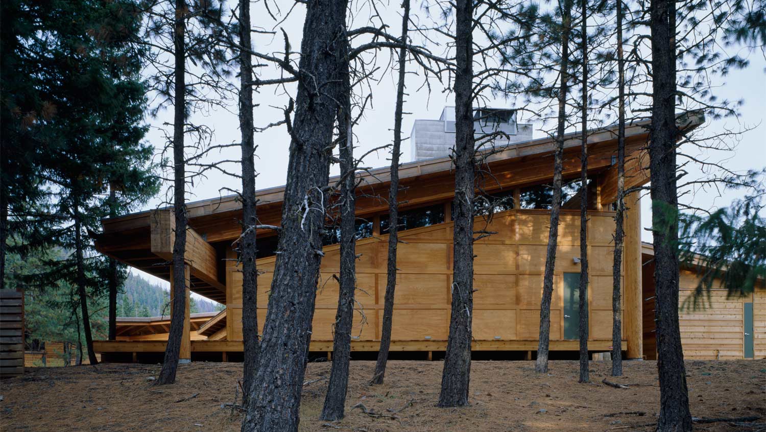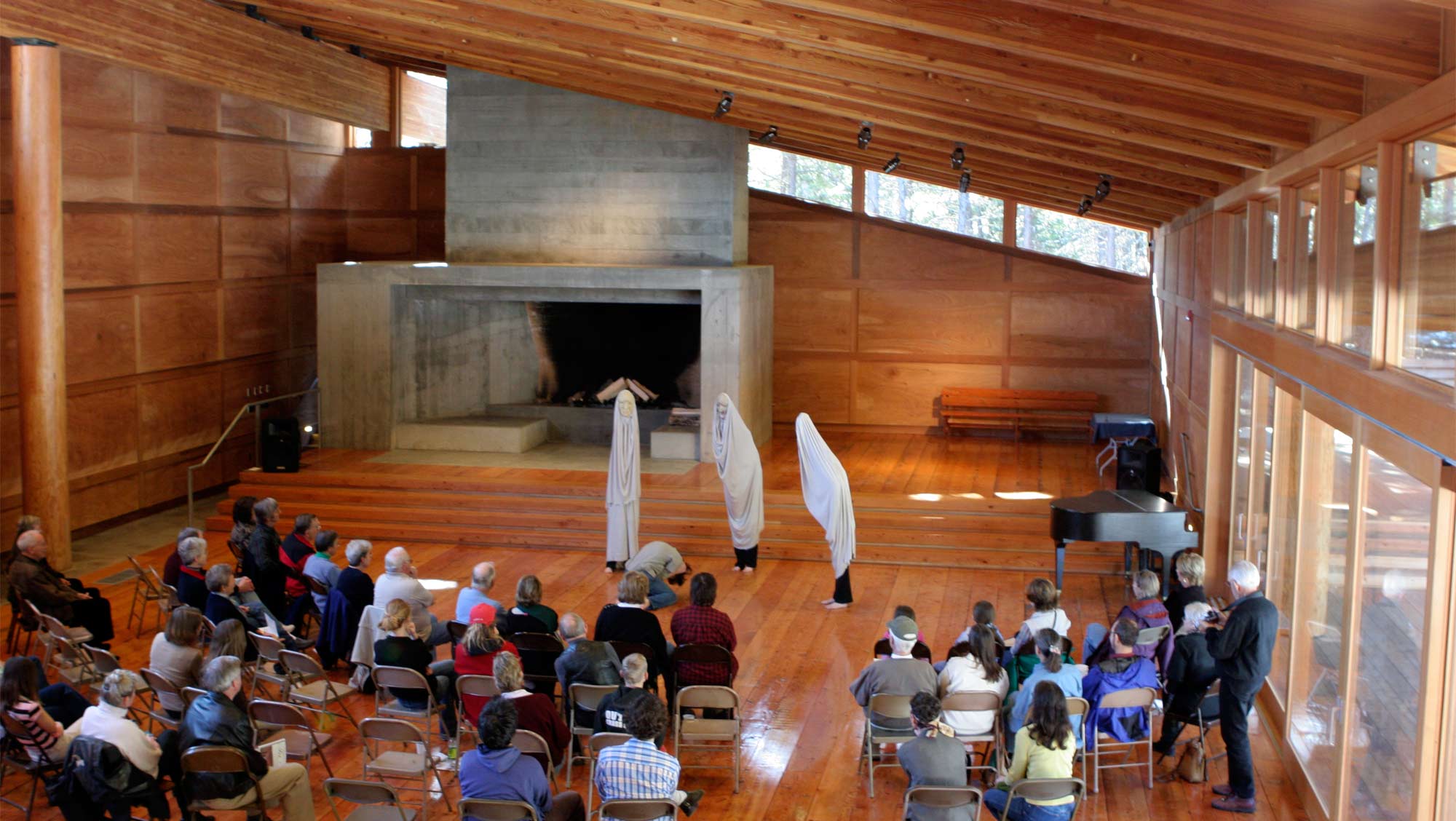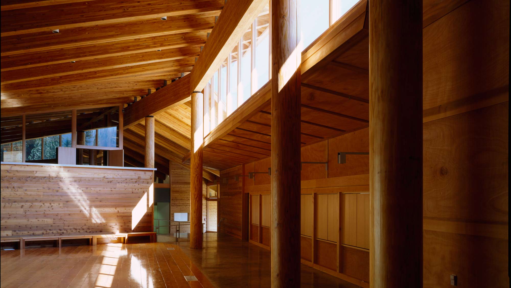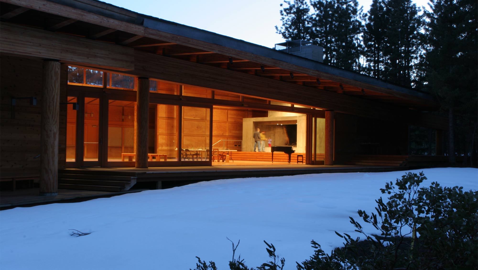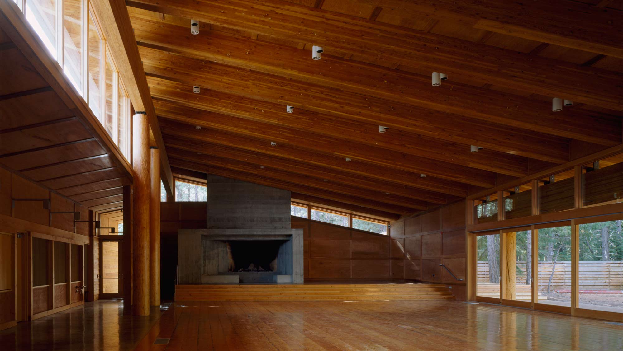 As part of this mission, Caldera operates a year-round center for the arts and environmental interpretation in the Cascade Range on the shores of Blue Lake. A constellation of residential structures, workshops and campsites, the Center focuses on a multi-use structure known as the Hearth Building. Completed in 2004, the building gathers the central functions of Caldera under a cedar-shake roof anchored by two monumental concrete fireplaces. Its crescent shaped plan is organized as several interlocking wood platforms. Three separate enclosures rest lightly on these platforms, allowing the multi-purpose performance hall, library, and art studios to open to sheltered space, light, ventilation and views on all sides. The Hearth Building echoes the form of the surrounding volcanic crater and the material and structure of the enclosing pine forest, creating a resonant space for education, gathering and artistic production.