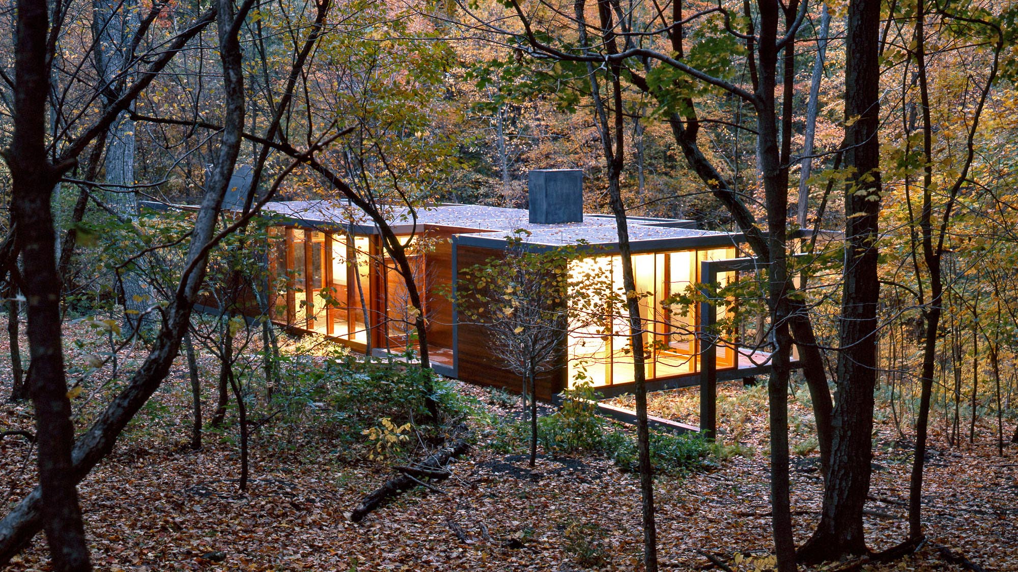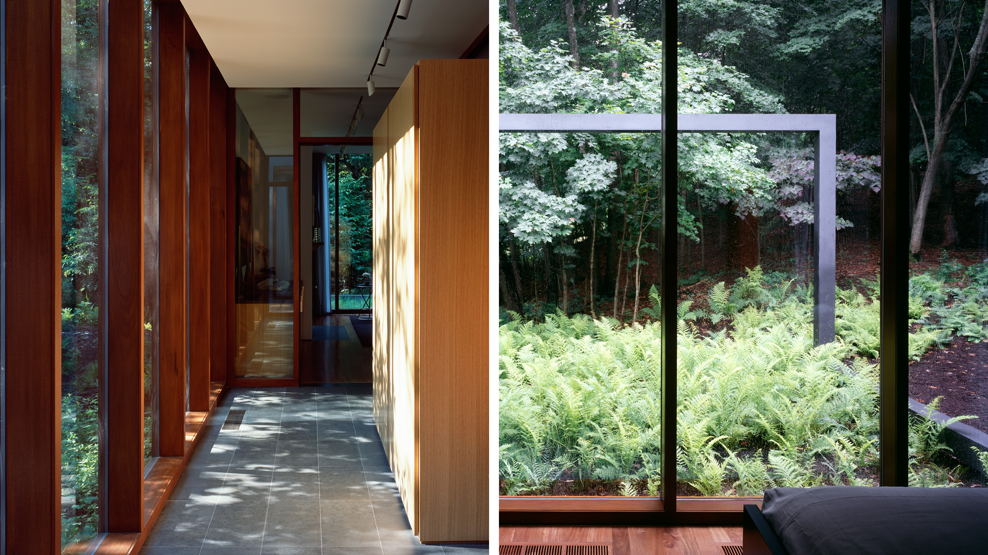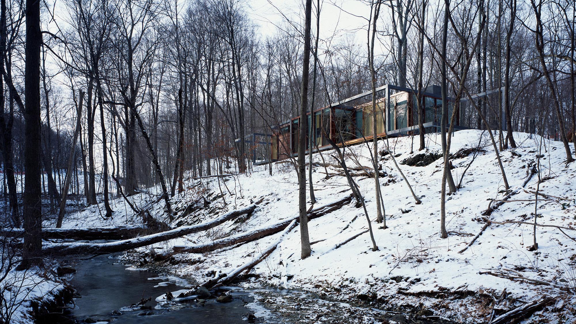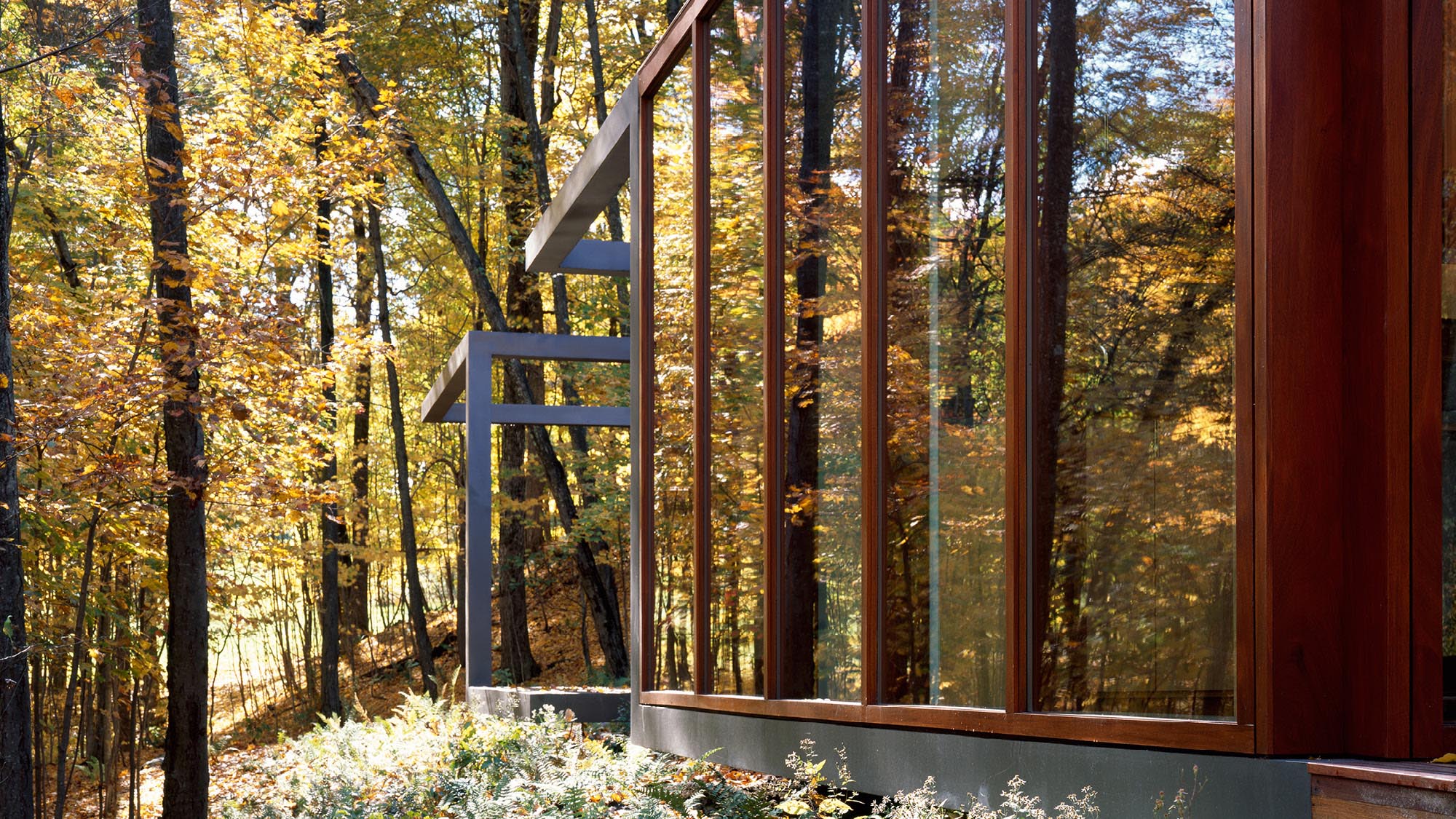 Balanced on the slopes above Ryder Creek, the house is located in a mature forest of oak, hickory, and birch. It is a place of silence, reflection and intimacy, reached by a long path from the main clearing. A continuous steel frame weaves through the woods and understory, blurring the boundaries between forest and dwelling. Panels of mahogany and floor-to-ceiling glass slip between, over, and through the frame as it meanders among the trees, leaving terraces and voids as spaces of transition and connection. The house is a place to escape the pressures of the city, and a platform for experiencing nature and the dramatic change of seasons.