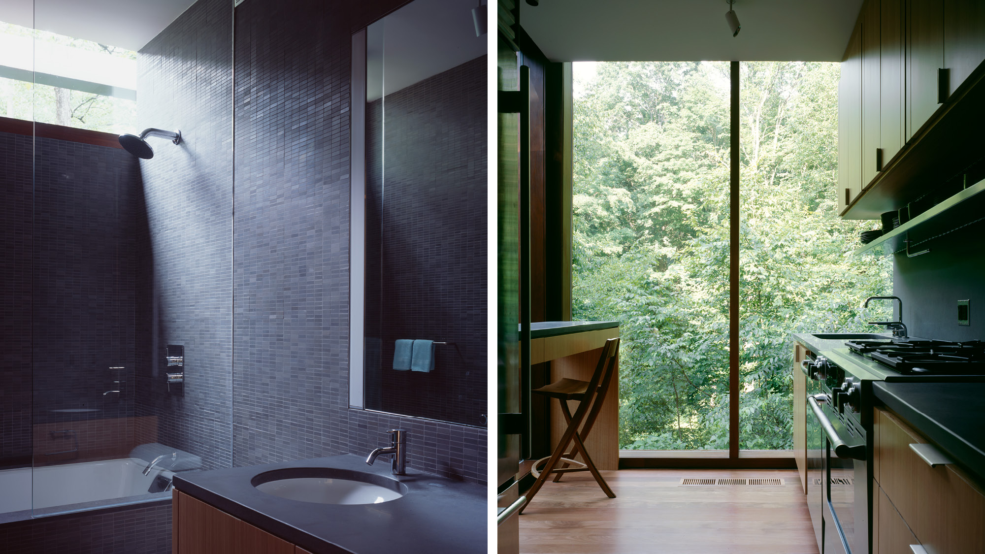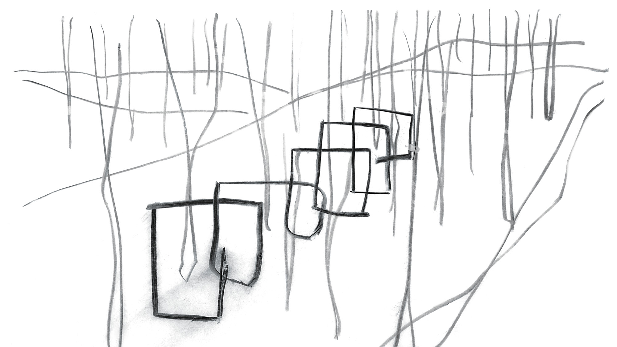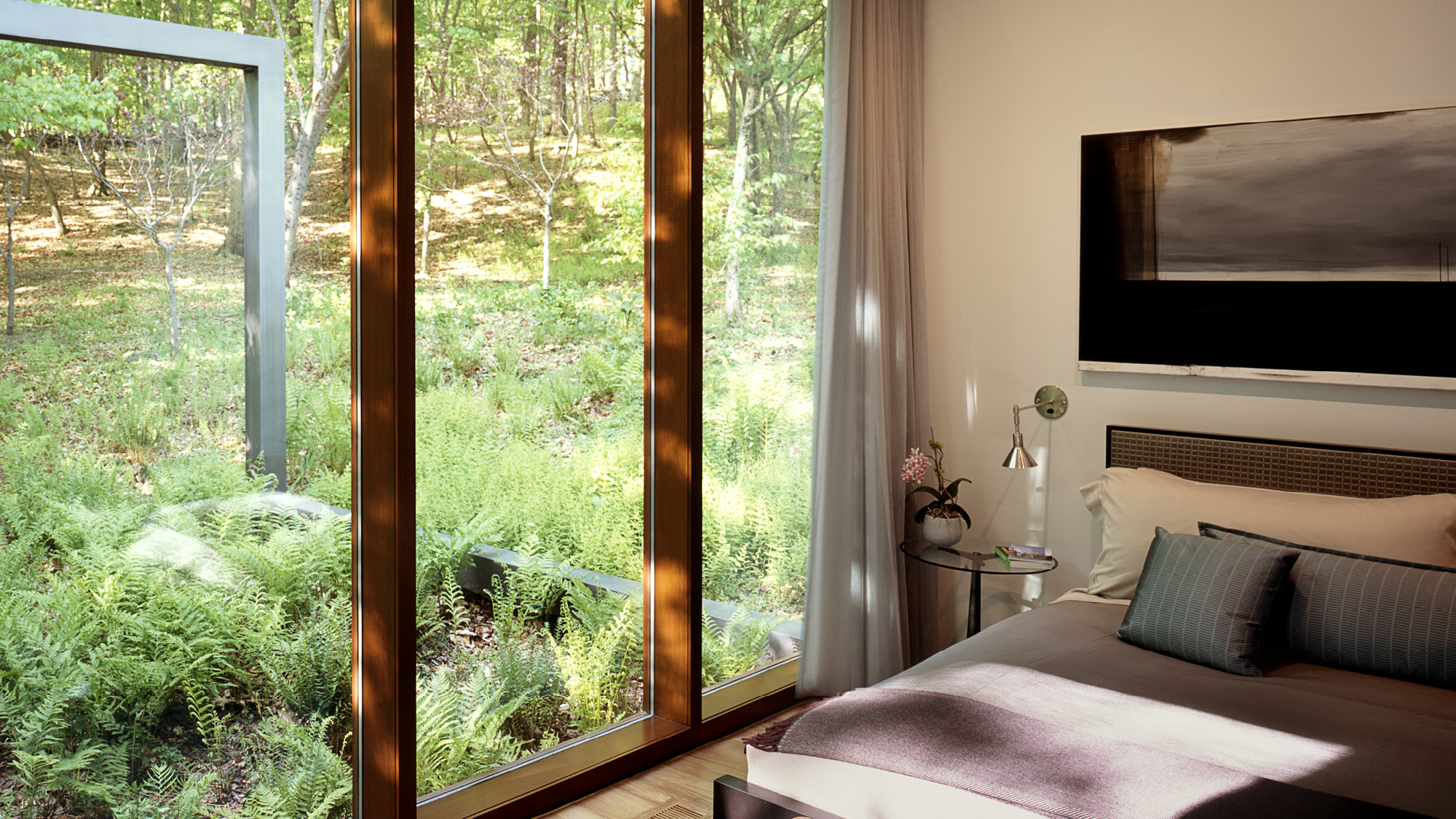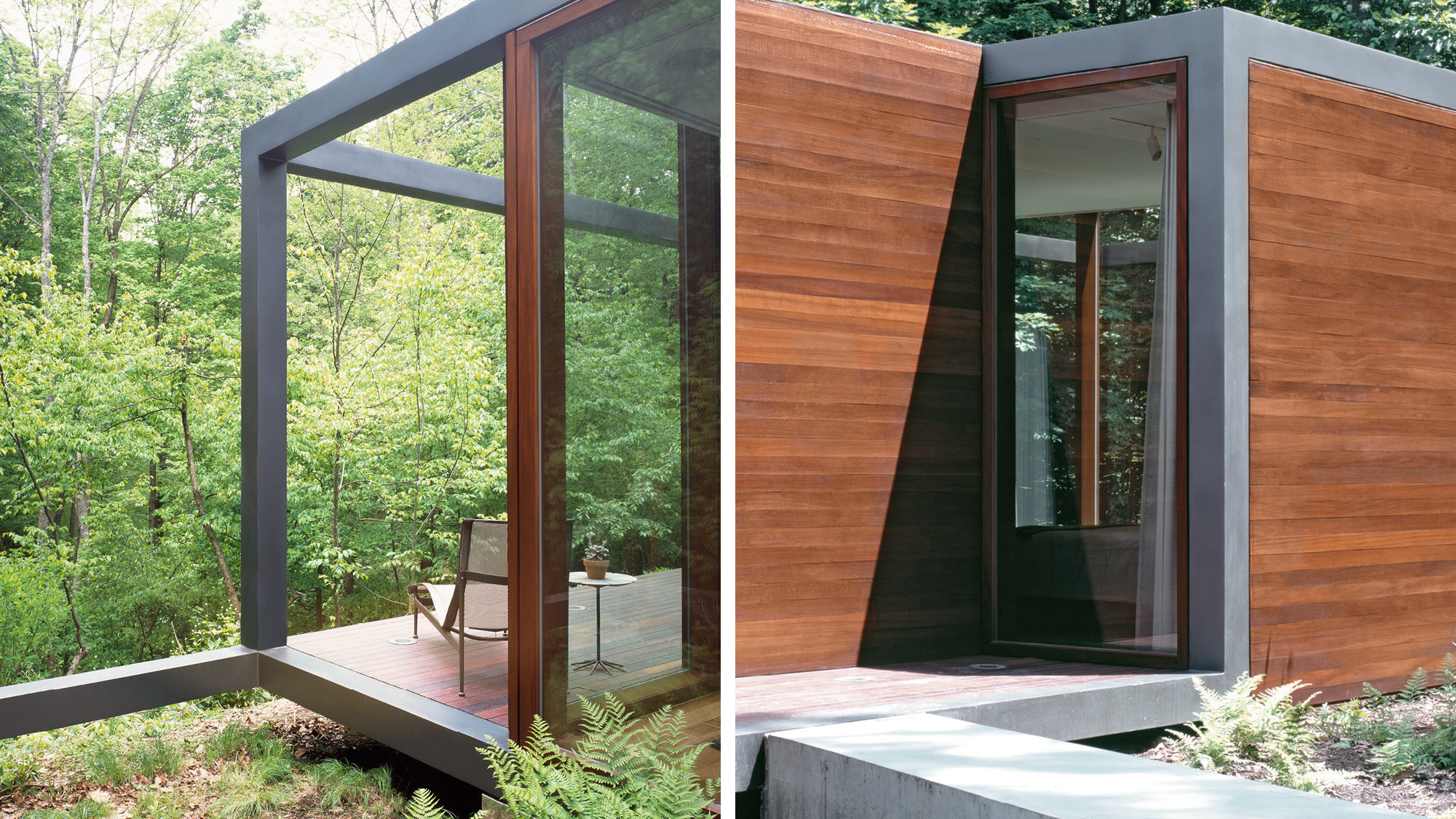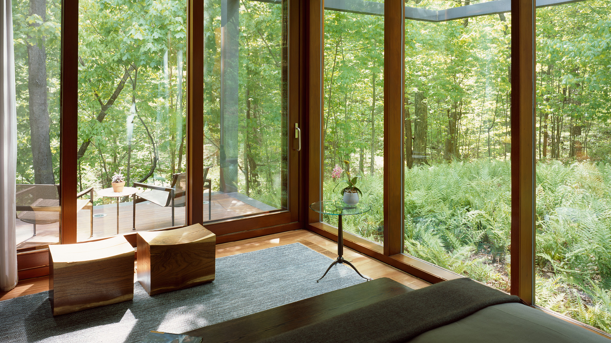 Balanced on the slopes above Ryder Creek, the house is located in a mature forest of oak, hickory, and birch. It is a place of silence, reflection and intimacy, reached by a long path from the main clearing. A continuous steel frame weaves through the woods and understory, blurring the boundaries between forest and dwelling. Panels of mahogany and floor-to-ceiling glass slip between, over, and through the frame as it meanders among the trees, leaving terraces and voids as spaces of transition and connection. The house is a place to escape the pressures of the city, and a platform for experiencing nature and the dramatic change of seasons.