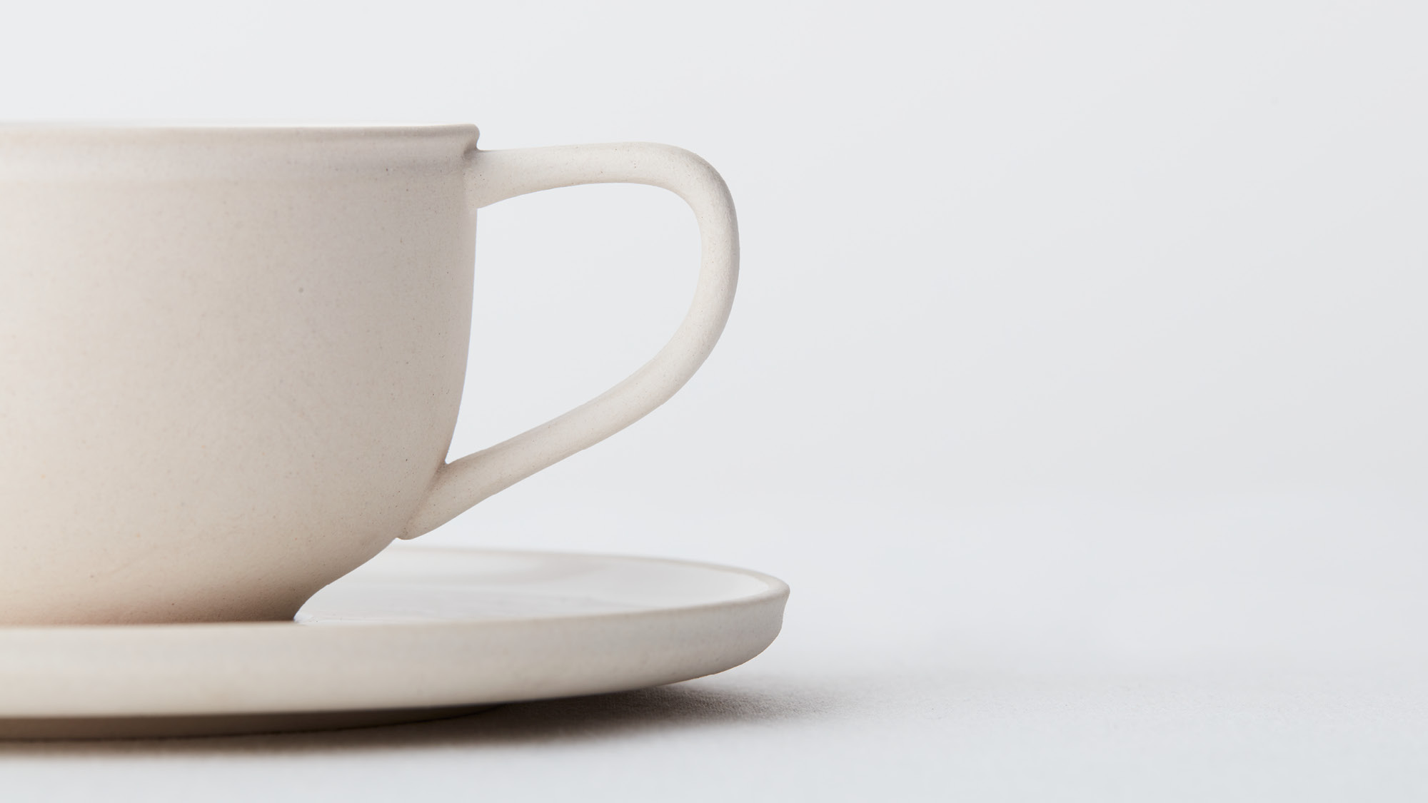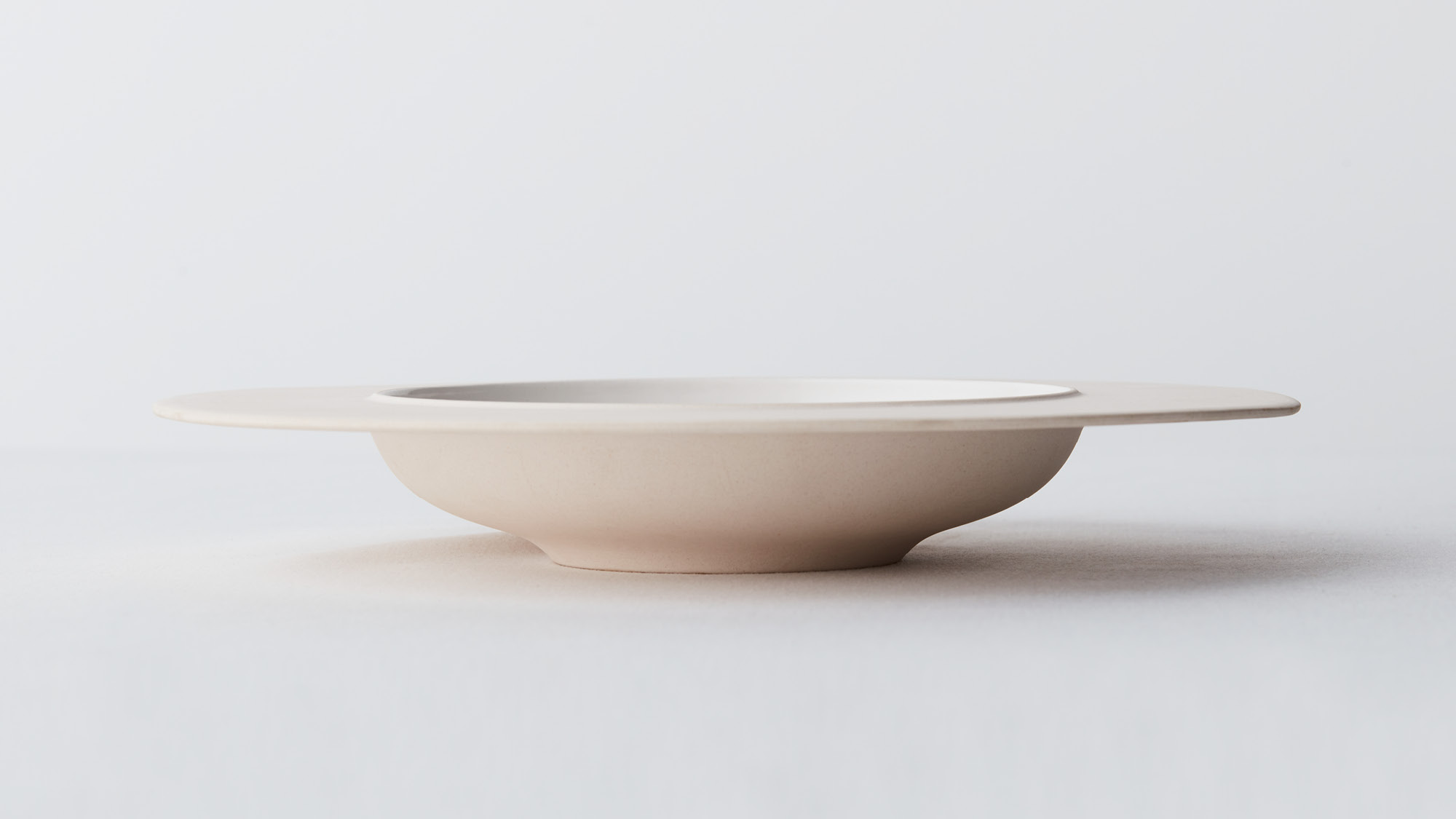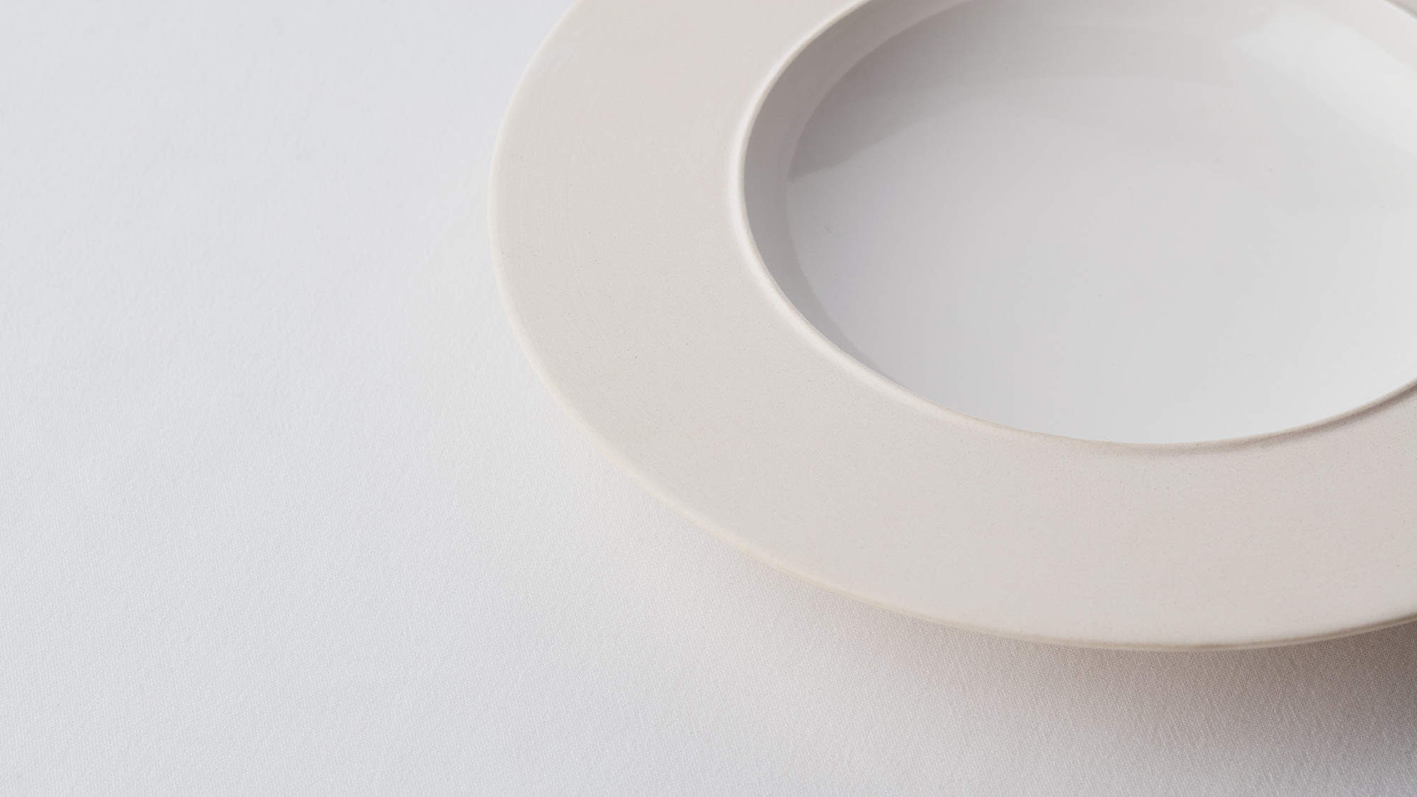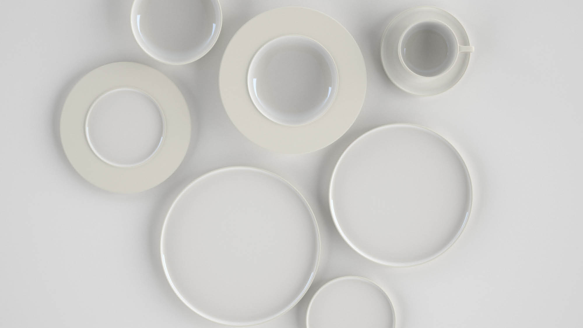 Composed of raw porcelain and white glaze, the eighteen-piece dinnerware suite provides a simple yet refined complement to the cuisine. The outer surfaces of the pieces are left unglazed, softening the light and revealing their materiality. The various pieces relate dimensionally, sharing a similar formal composition and progressive sequence of profiles and radii. In order to create subtle tension and definition with the surface of the table, the pieces appear to hover by means of a small, concealed “foot”, a feature common to traditional ceramics. Other pieces, such as the teacup, are attuned to the body, offering a sense of warmth and welcome as the perfect finish to a meal.