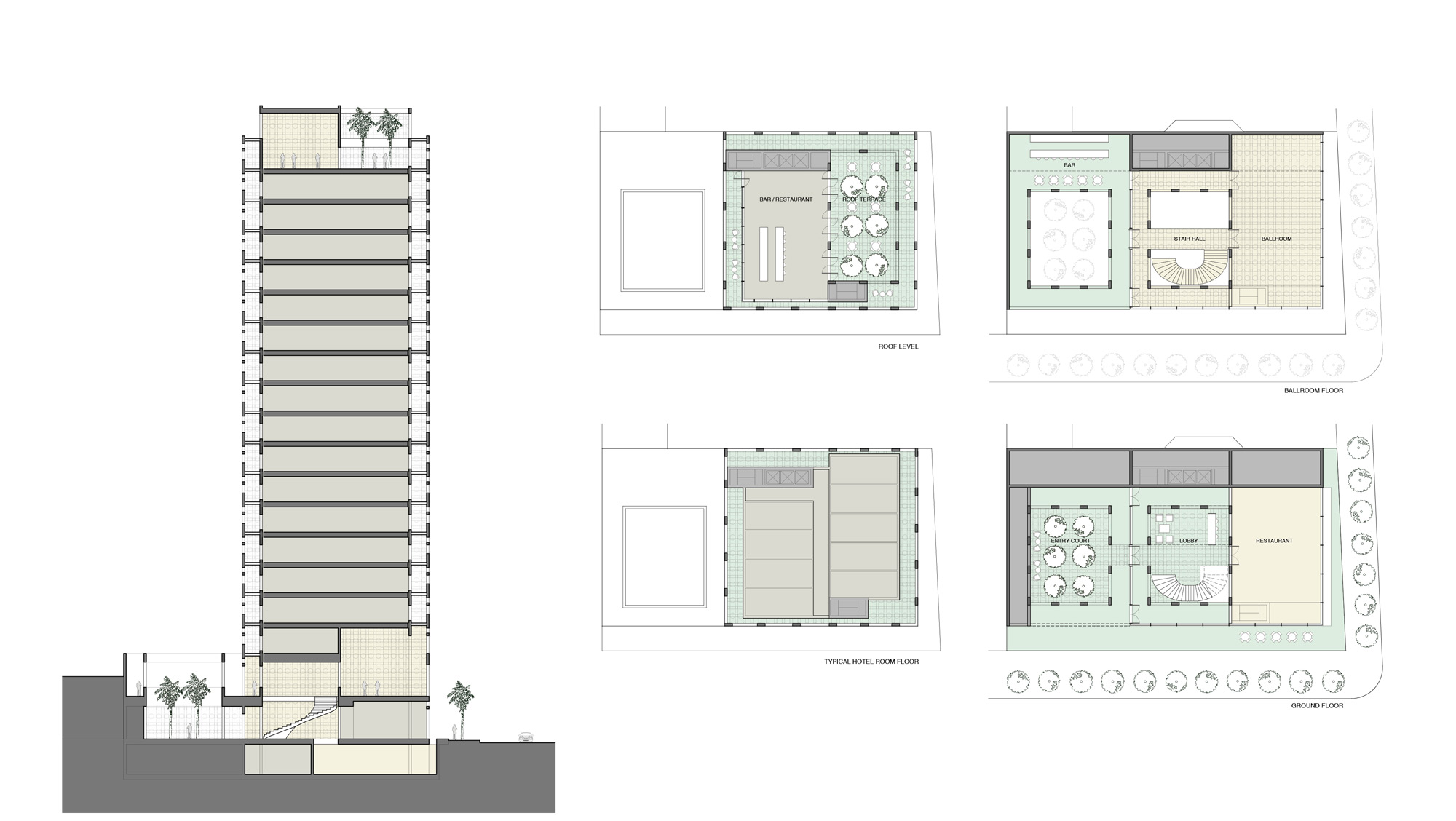 In 2008, Allied Works developed a proposal for a 19-story boutique hotel with Ian Schrager as a pilot project for a planned international chain. The 101,000 s.f. structure features 140 guest rooms, restaurant, banquet hall and recreational facilities including a rooftop pool and club. The site faces the Hudson River, adjacent to Pier 40 and Riverfront Park, on the formerly industrial western edge of Greenwich Village.