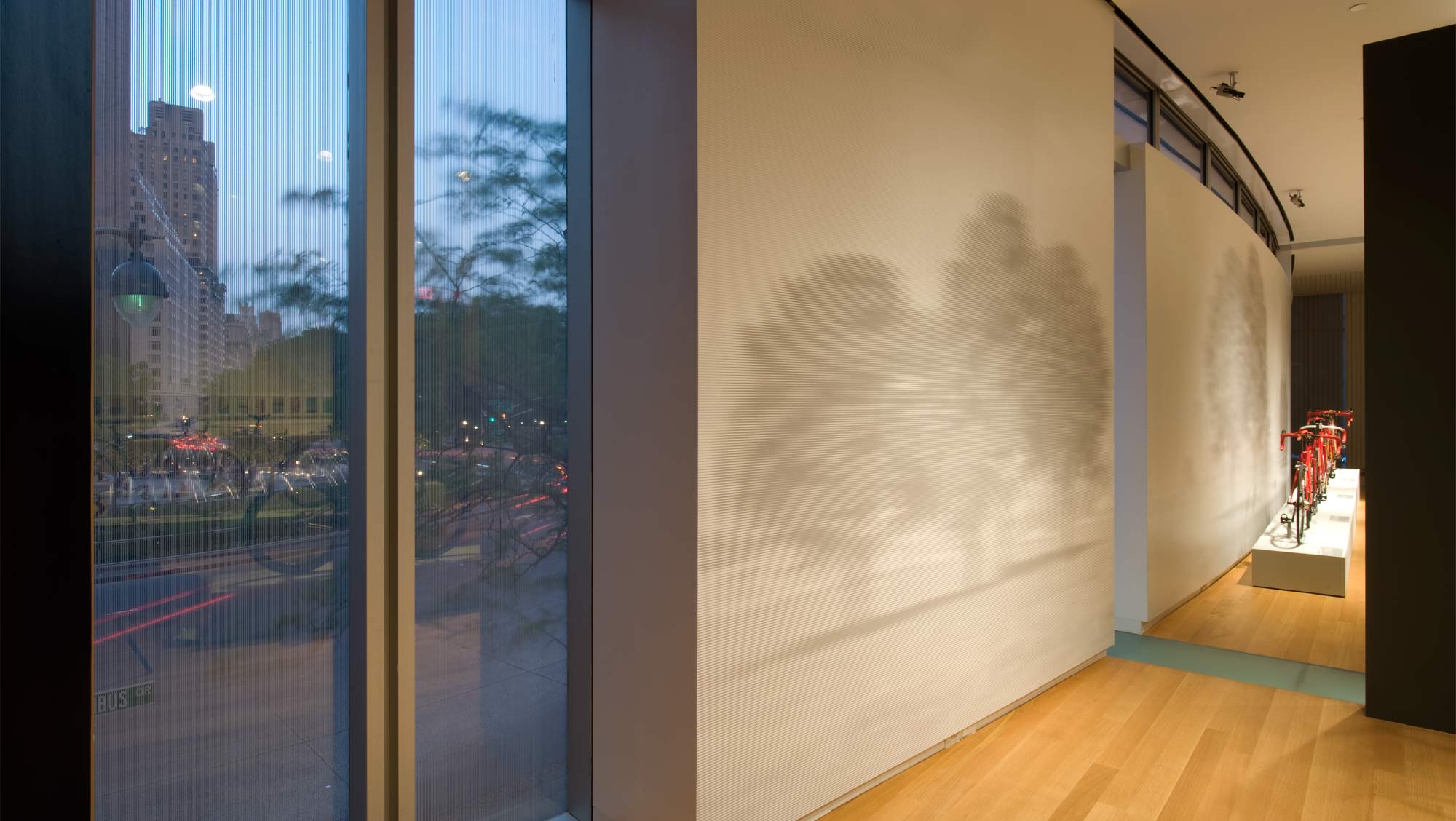 The design opens the building to natural light and views to Central Park and city on all sides. A series of cuts open the building’s concrete shell, each one a continuous line that unites the façade, walls, floors and ceilings. This single act transforms and edits the building from a closed volume to a light-filled, cantilevered structure. Inset with transparent and fritted glass, these cuts weave across the new terracotta-tiled façade. Each of the 22,000 tiles is finished in an iridescent glaze—designed by artist Christine Jetten and fabricator Royal Tichelaar Makkum—that changes with the time of day and point of view. With prospects along Broadway, across the Park, and to the Hudson River, the Museum offers new connections between the creative works it houses, the programs and artists it supports, and the life of the city.