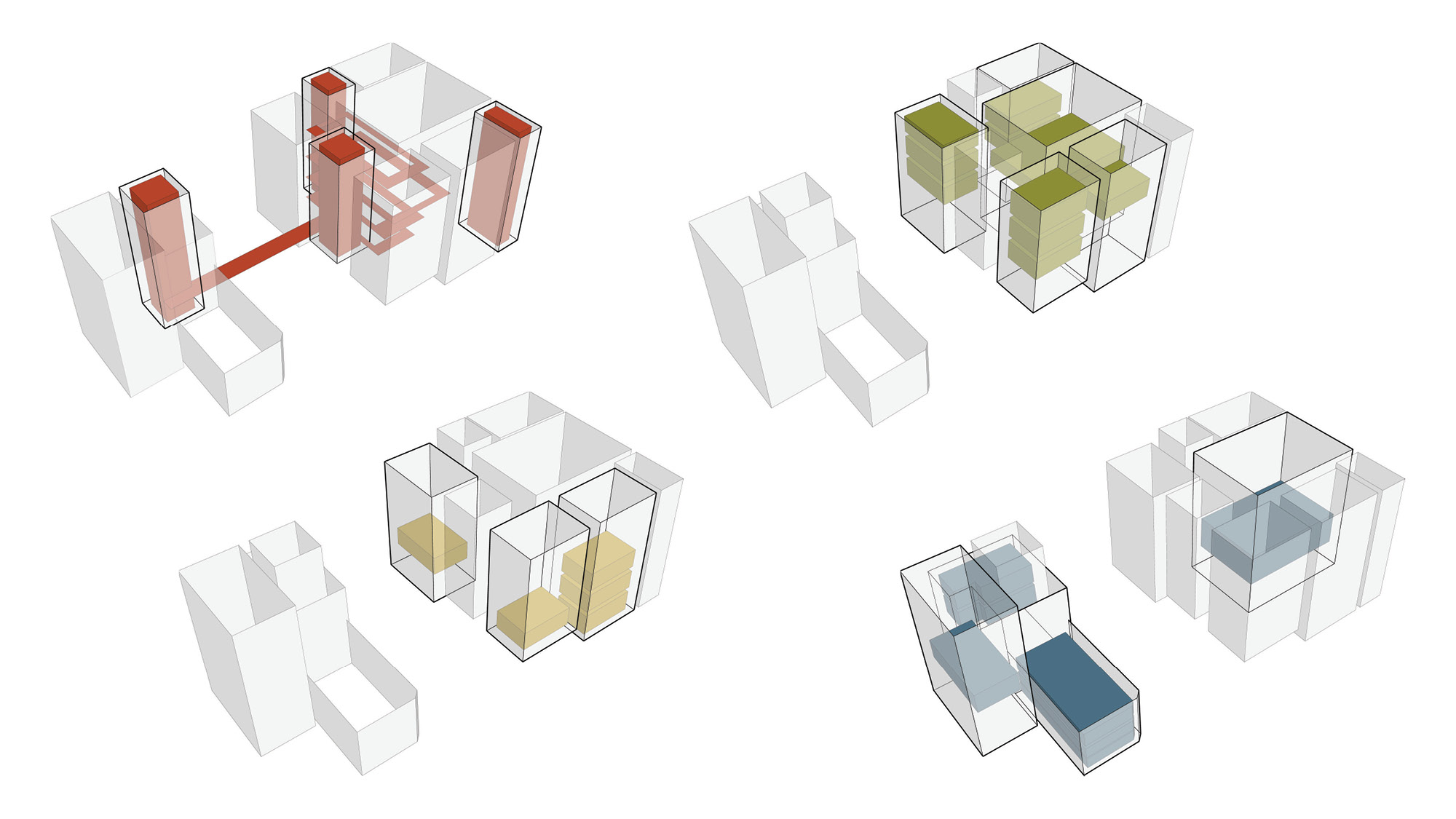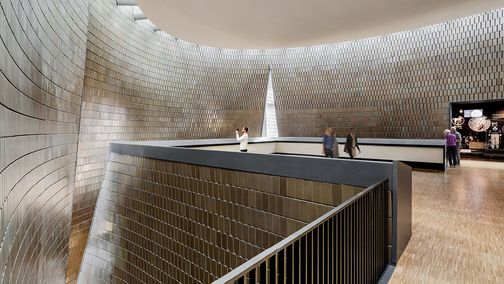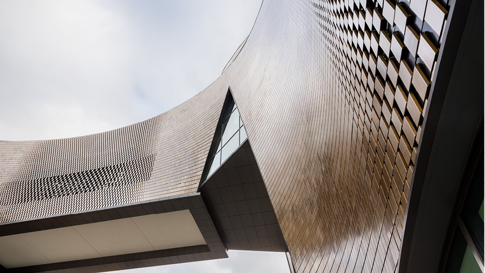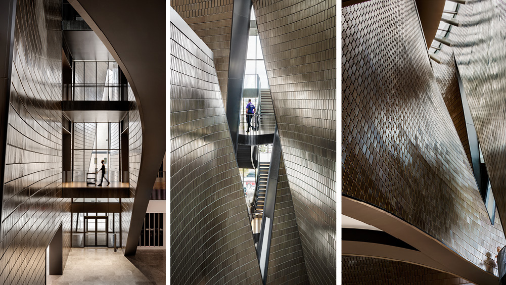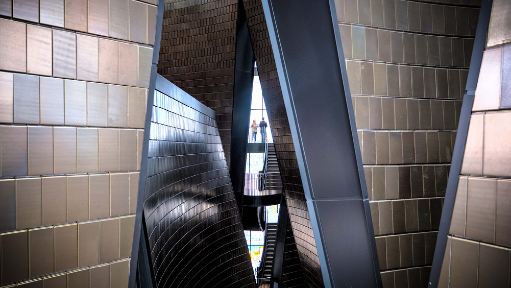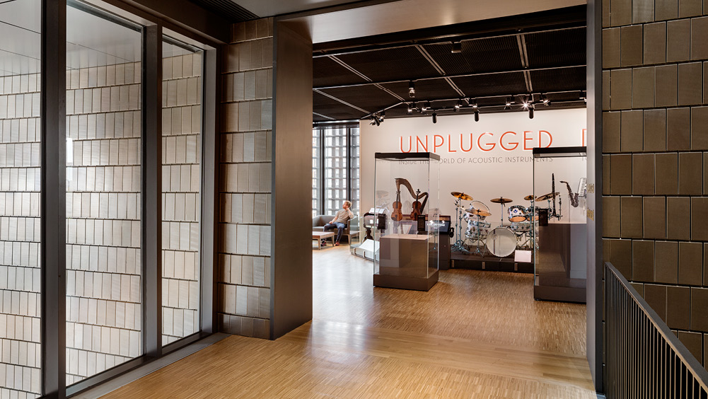 The building is organized as a series of nine interlocking towers that showcase the many diverse programs, collections and offerings of the Centre. Wrapped inside and outside in glazed terra cotta that evokes the earth and light of the prairie, the formal and material expression allows for a range of dynamic viewpoints and connections to the surrounding context. From the street, sound and light draws visitors up into the performance, education spaces and galleries above. While the towers hold acoustically distinct volumes or “stages”, the spaces between are the connective tissue of the Centre, allowing visitors to experience a full spectrum of sound and activity. Expanses of glass and filtered screens frame the city and landscape beyond.