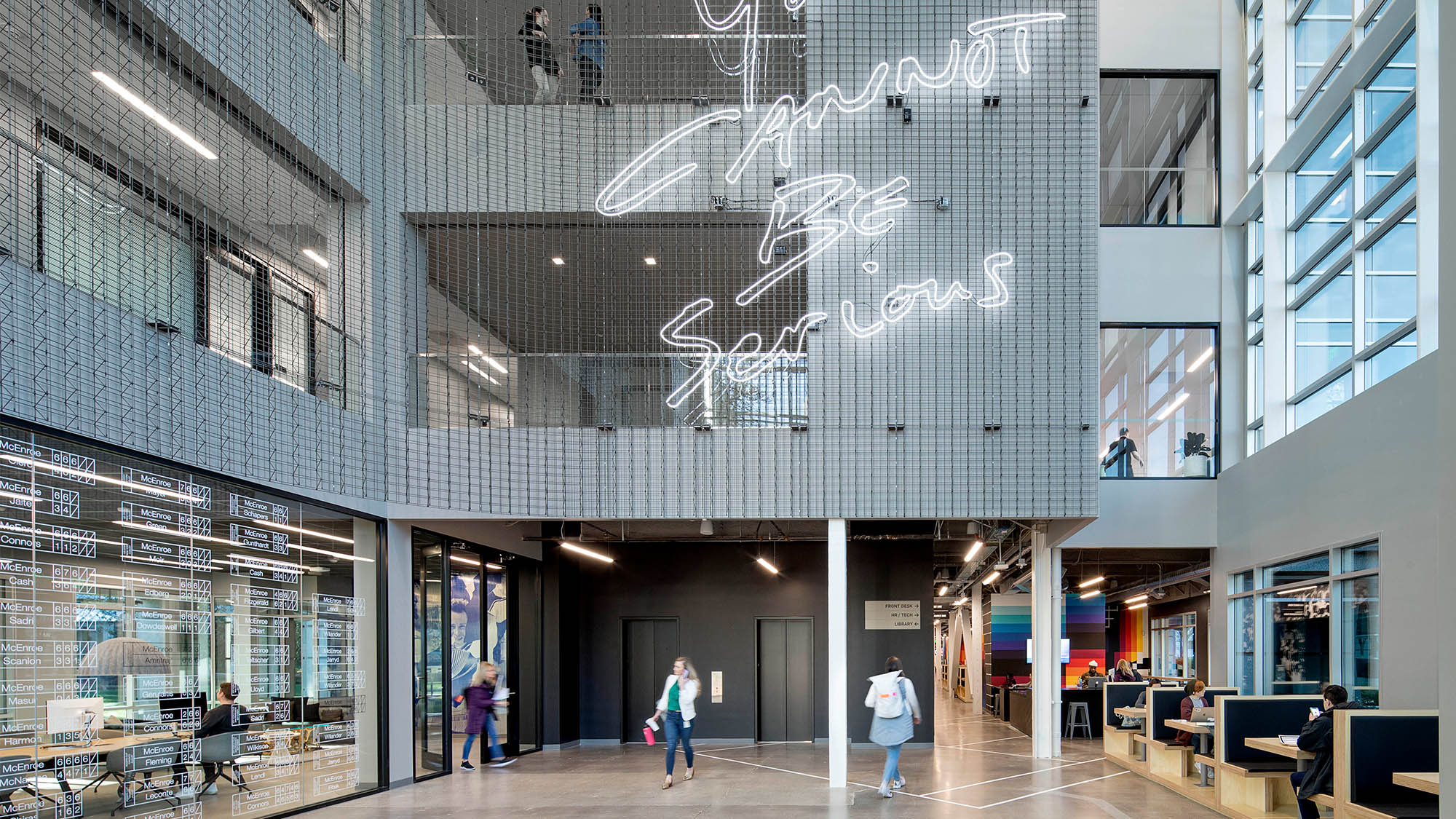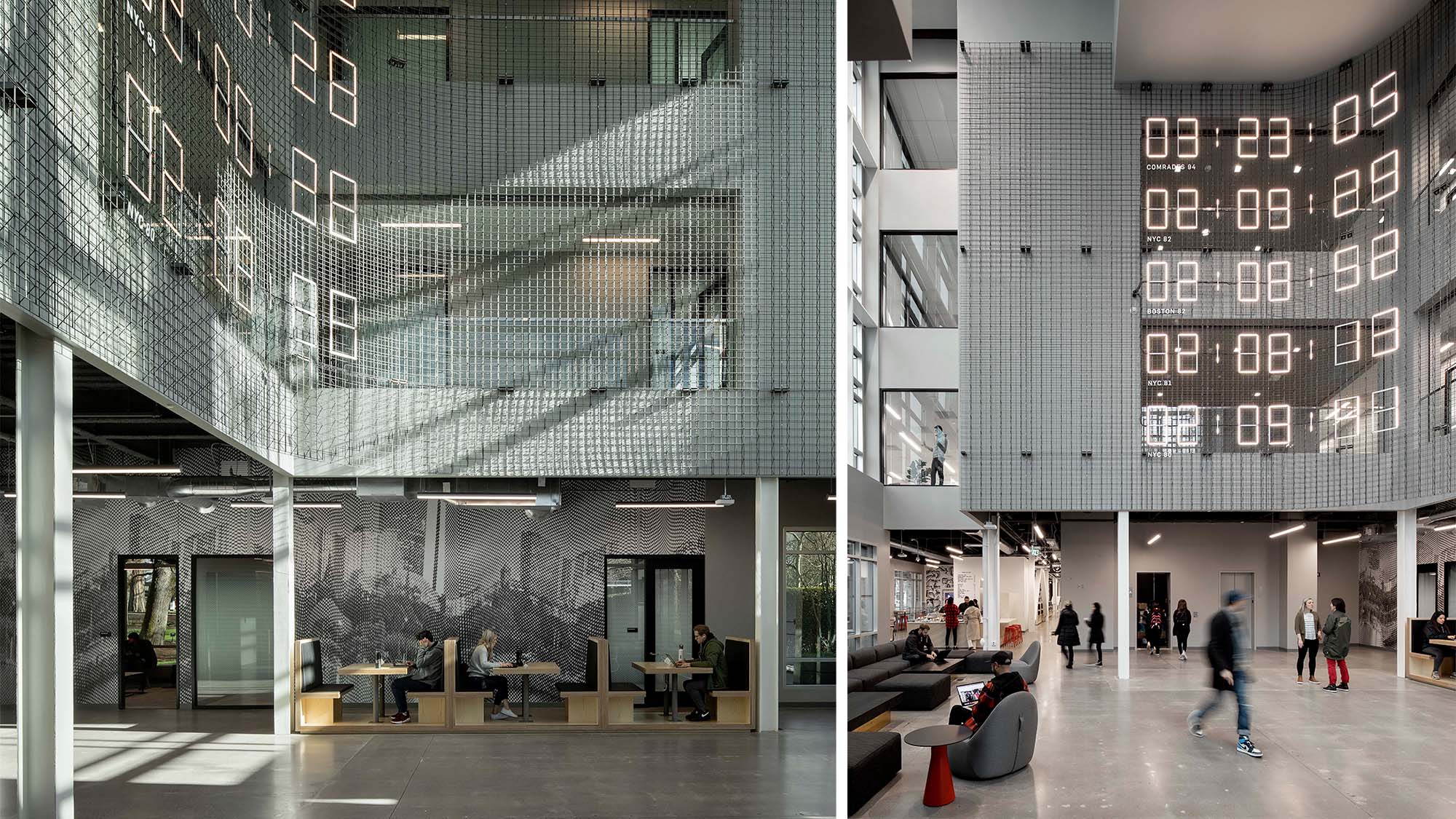 redesign the two buildings that frame the main entry to campus— Next%, and John McEnroe. Mirrored across a plaza, the 4-story buildings are each 84,000 s.f. Supporting a ‘freestyle’ work environment, the program includes a variety of shared, individual, and specialty spaces including libraries, lounges, a tea bar, a recreation space, and a meditation room. At the heart of the building is the ‘Arena,’ a 4-story space defined by a metal mesh enclosure that connects the entry, to double-height lounges, kitchens, conference rooms, and open workspace. Natural daylight filters into the Arena and adjacent spaces on all levels. Views out to the adjacent lake, park-like landscapes, and civic plazas on the Nike campus provide connection and orientation.
