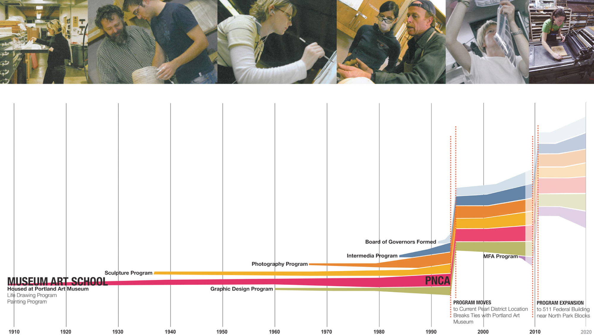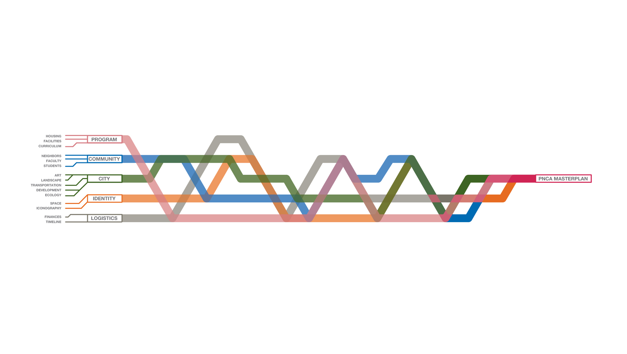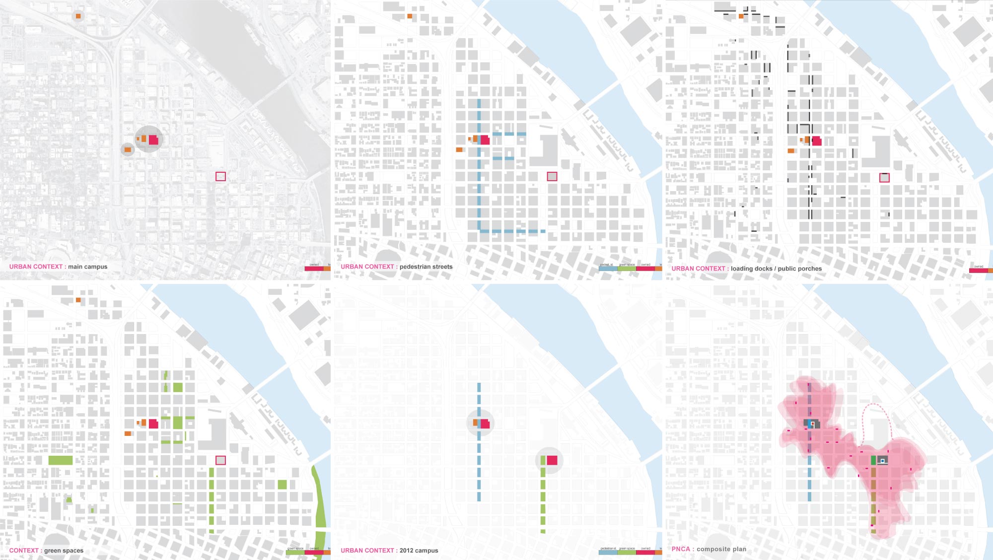 Completed in 2005, The Master Plan addresses programming, property acquisition strategies and facilities utilization over a 20-year period. At the same time, it identifies a number of independent and transferrable strategies that give expression to PNCA’s educational vision and enhance the college’s connections and presence both locally and internationally. One of the principal goals of the master plan was to give PNCA a clear and cohesive identity within a changing urban setting. Numerous models to achieve this were considered, from the overall organization and distribution of facilities to less concrete factors such as outreach programs, temporary installations, events, signage and wayfinding.