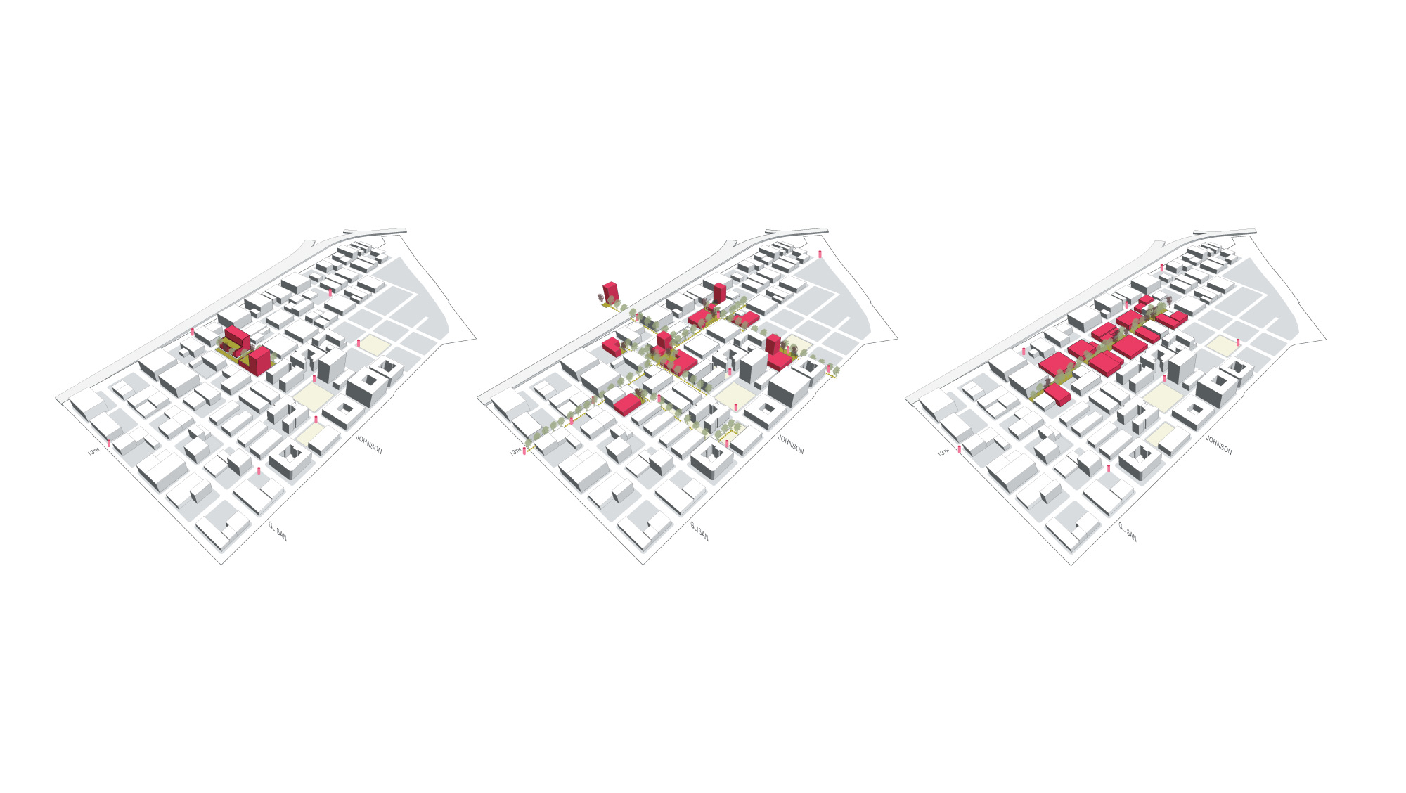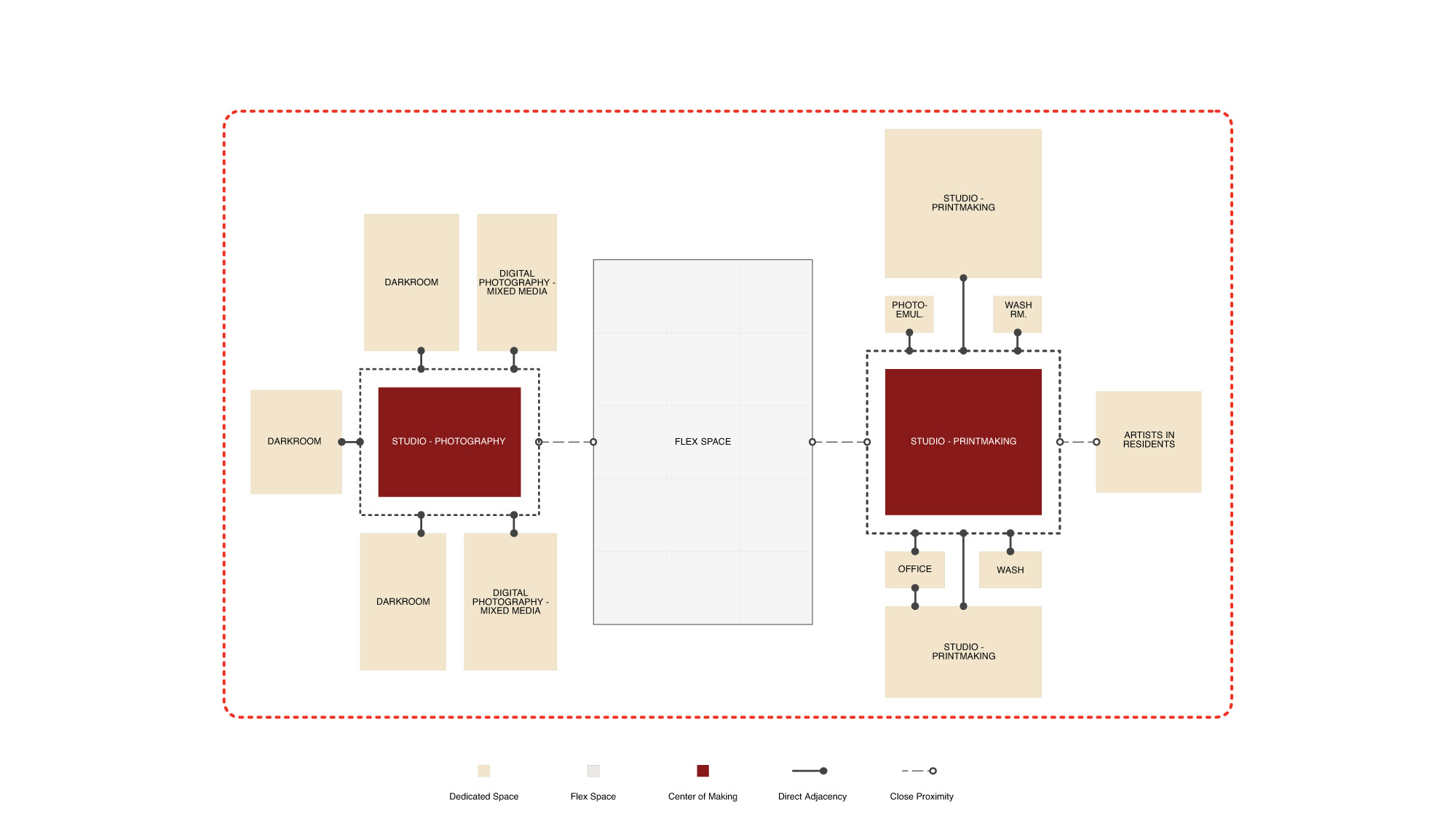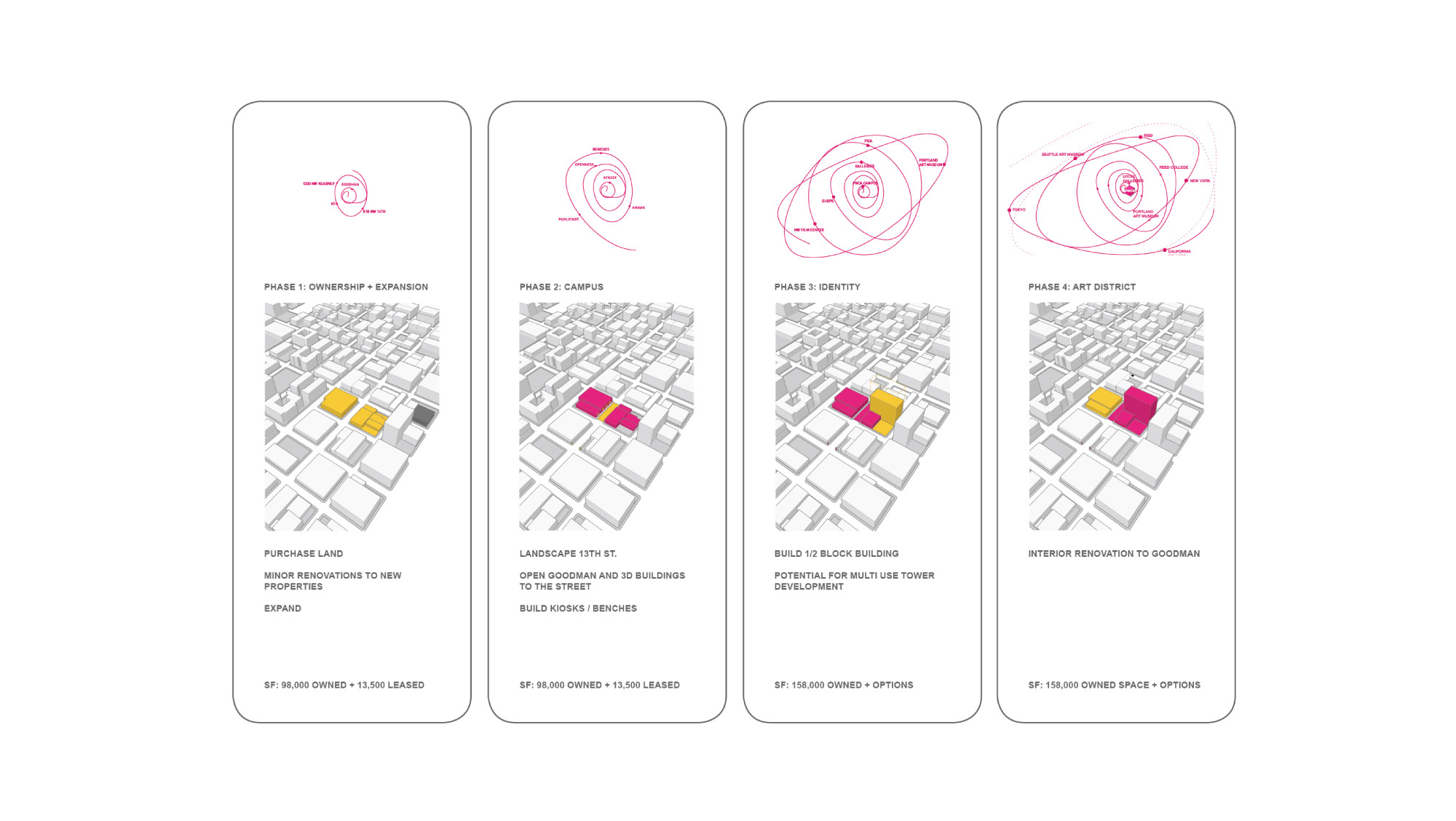 Completed in 2005, The Master Plan addresses programming, property acquisition strategies and facilities utilization over a 20-year period. At the same time, it identifies a number of independent and transferrable strategies that give expression to PNCA’s educational vision and enhance the college’s connections and presence both locally and internationally. One of the principal goals of the master plan was to give PNCA a clear and cohesive identity within a changing urban setting. Numerous models to achieve this were considered, from the overall organization and distribution of facilities to less concrete factors such as outreach programs, temporary installations, events, signage and wayfinding.