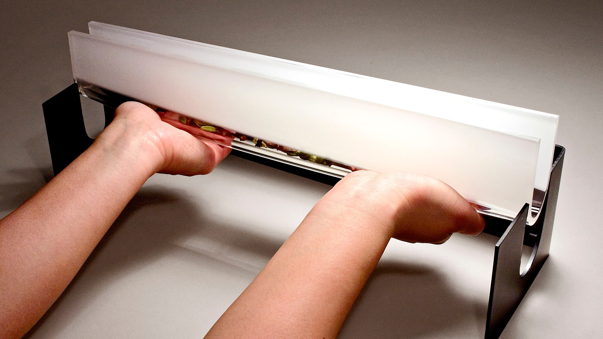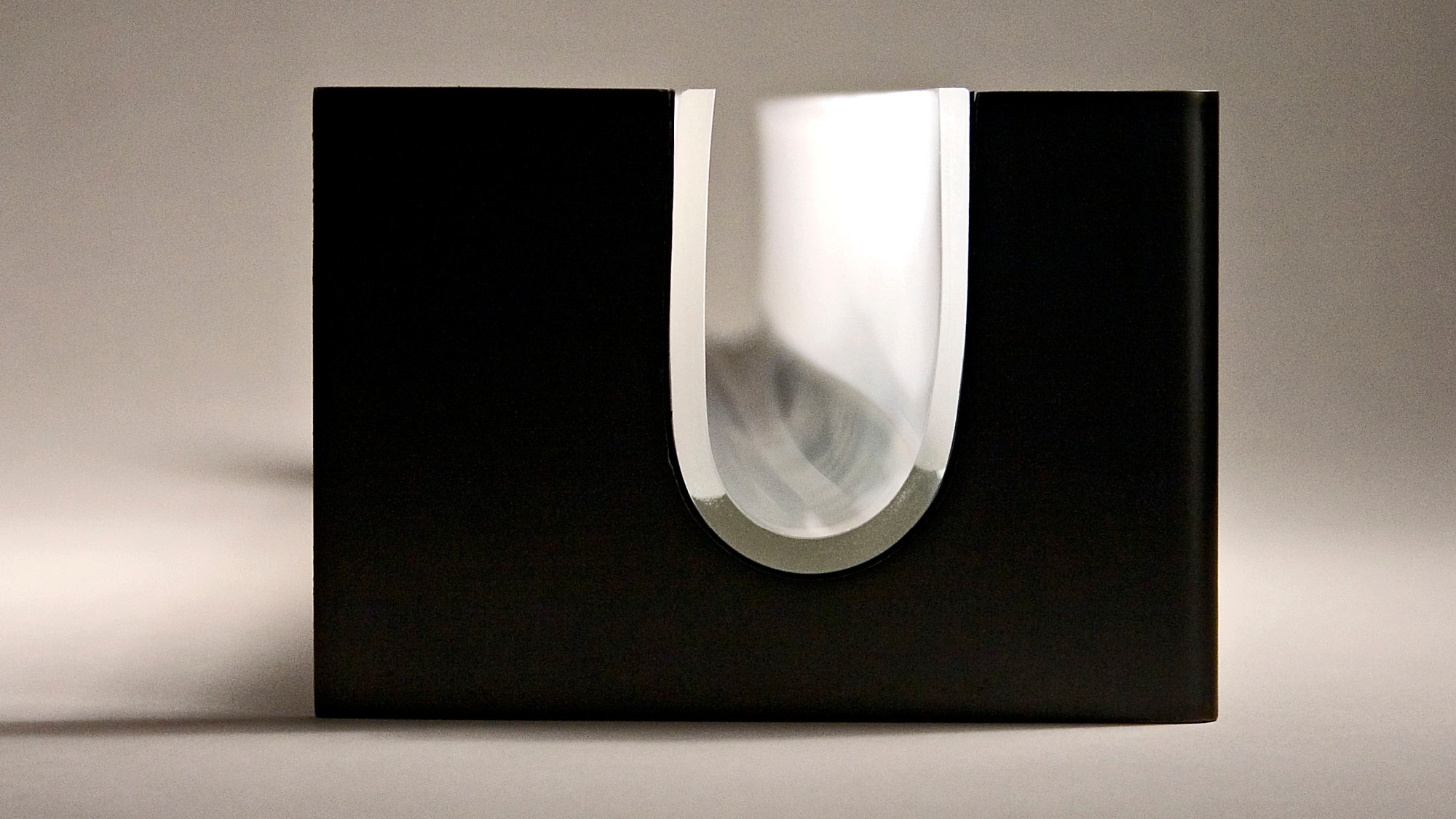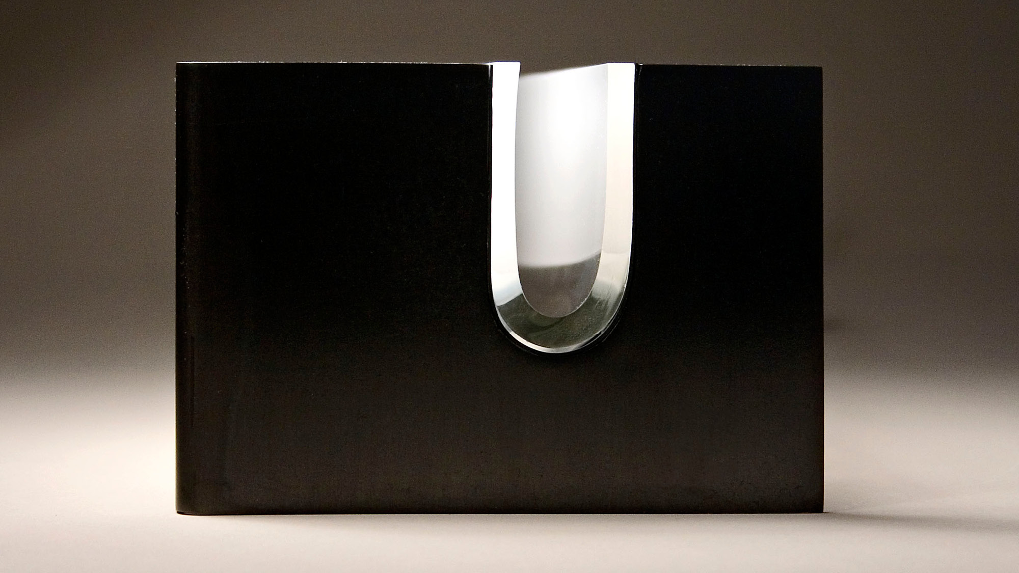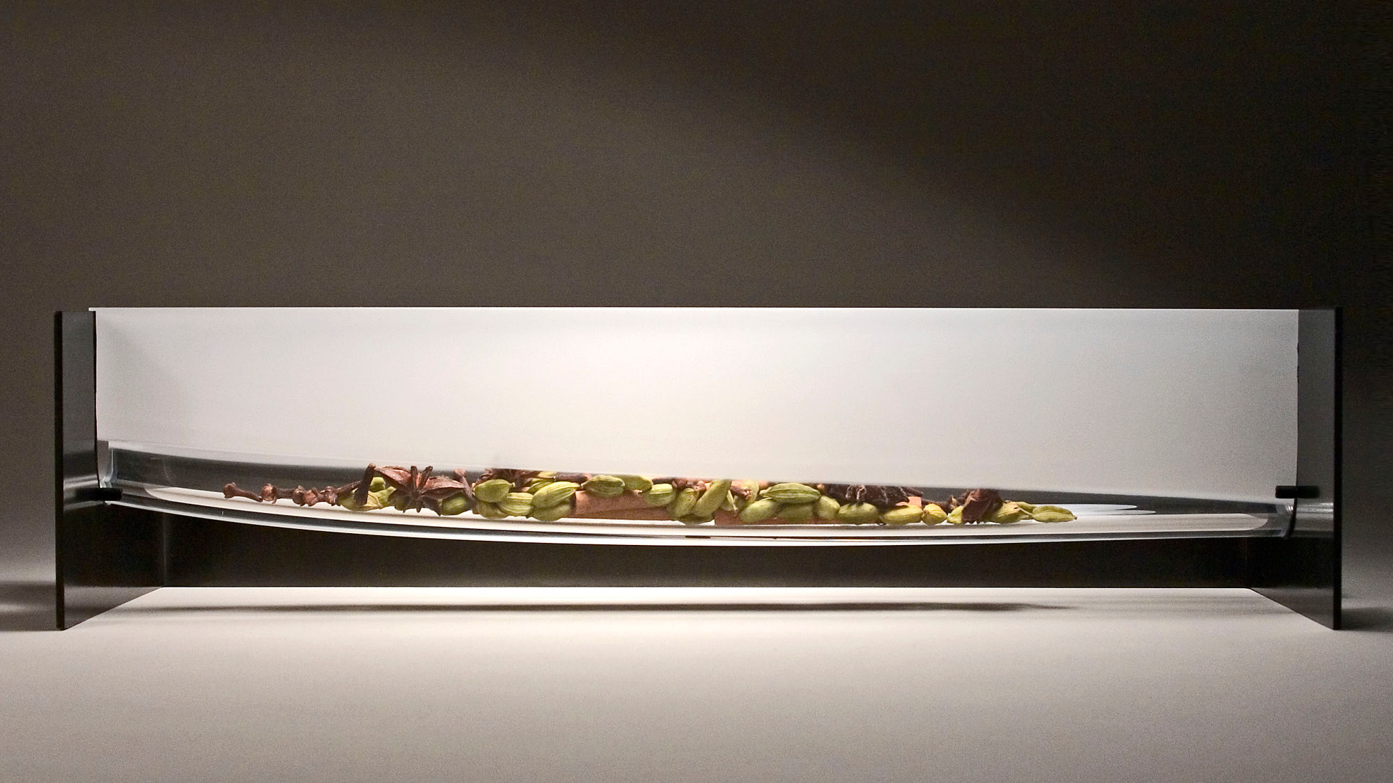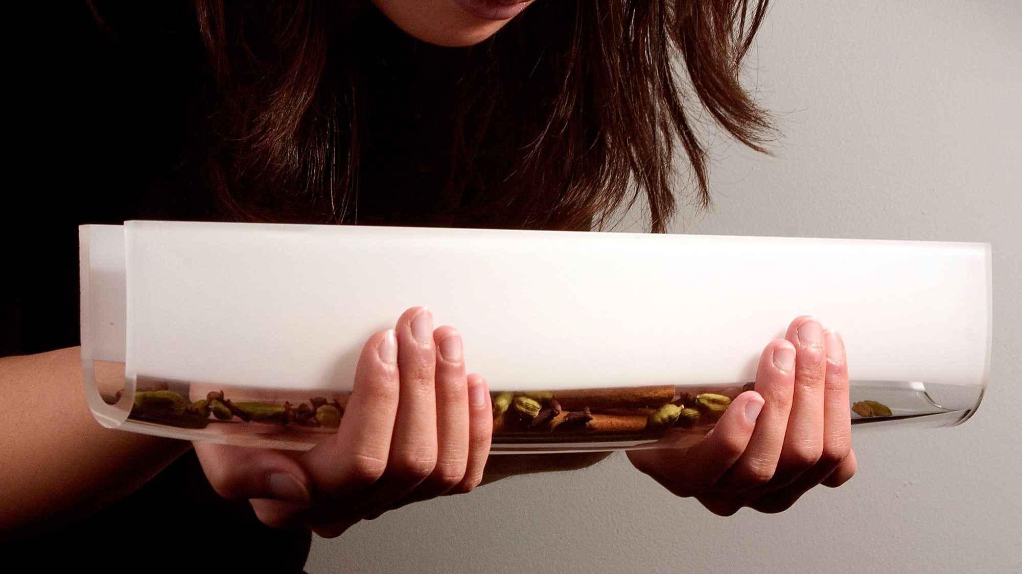 Inspired by the landscape of the Rift Valley between Jordan and the West Bank, we took the traditional spice box archetype—often a tower or house form wrought in metal—and turned it on its end. The resulting glass vessel is four hands wide and subtly curved and etched. During the havdalah ceremony, the besamim is passed from person to person and the scents of spice are inhaled. Our concept focuses on the act of passage: the vessel cannot stand alone and must be offered and received with two hands. Its perfectly matched steel base gives it a place of honor within one’s home. Whether in the hand or at rest, the luster and translucency of the glass highlights the beauty of the spices contained within.