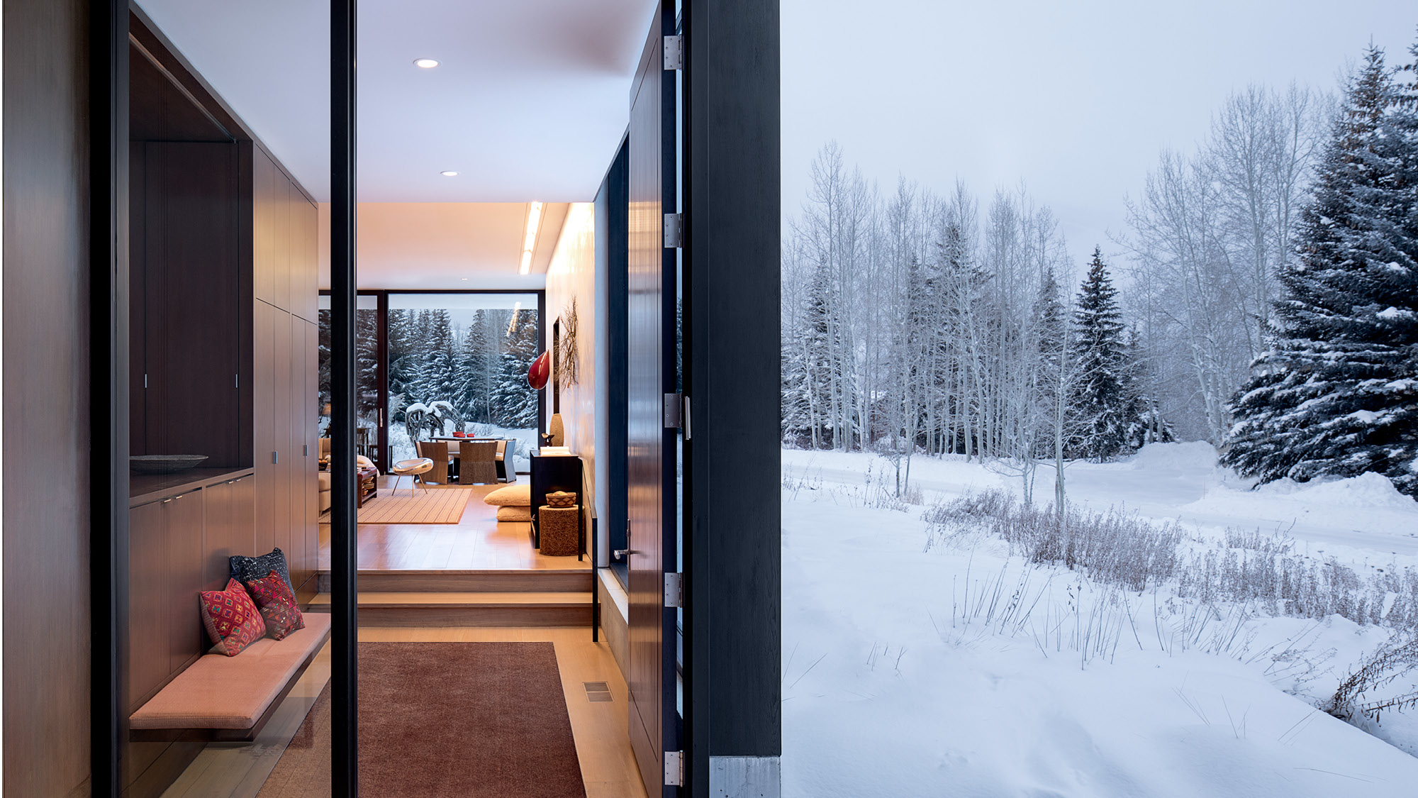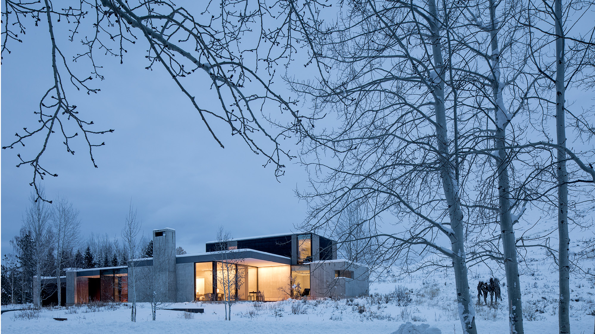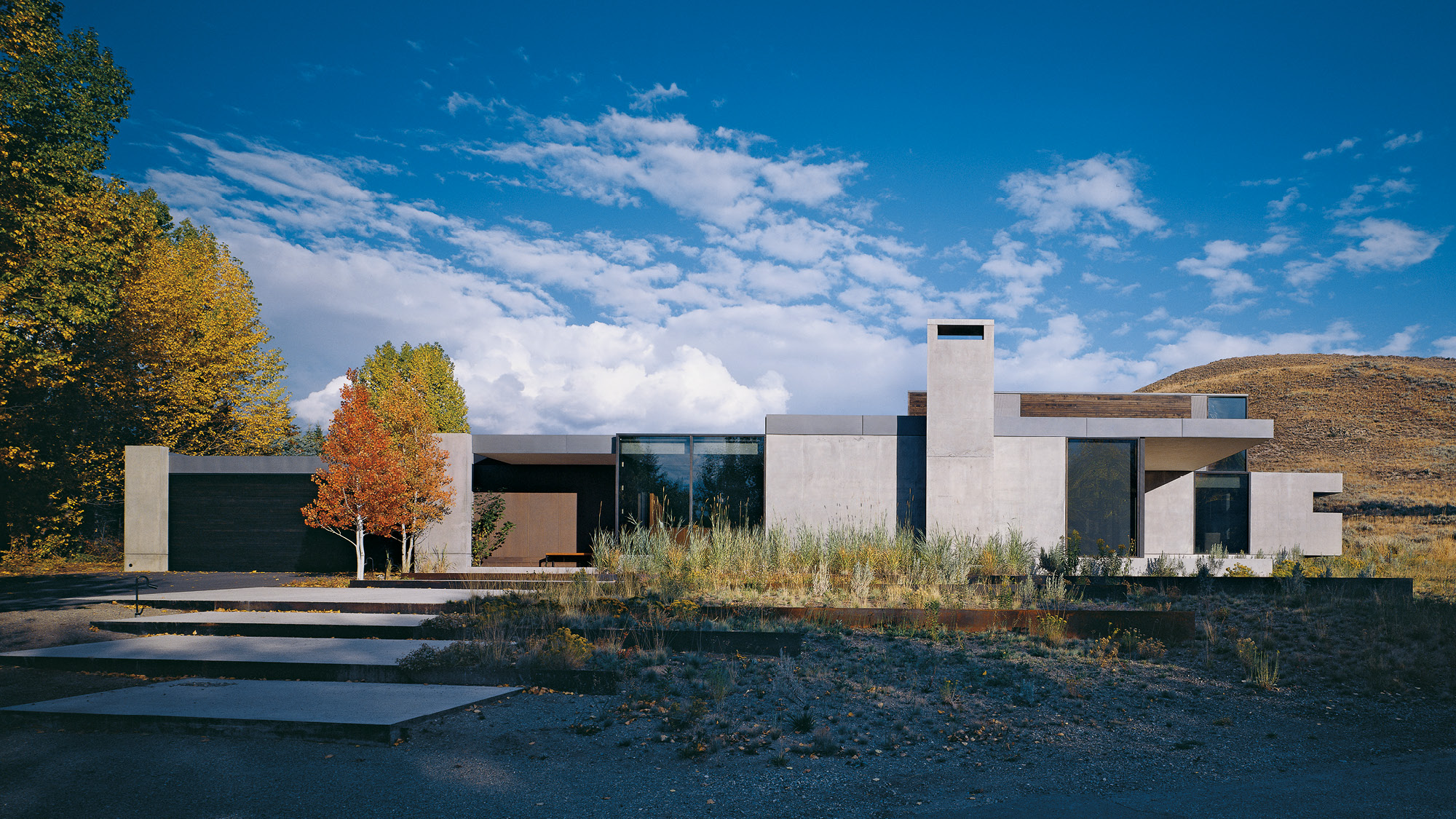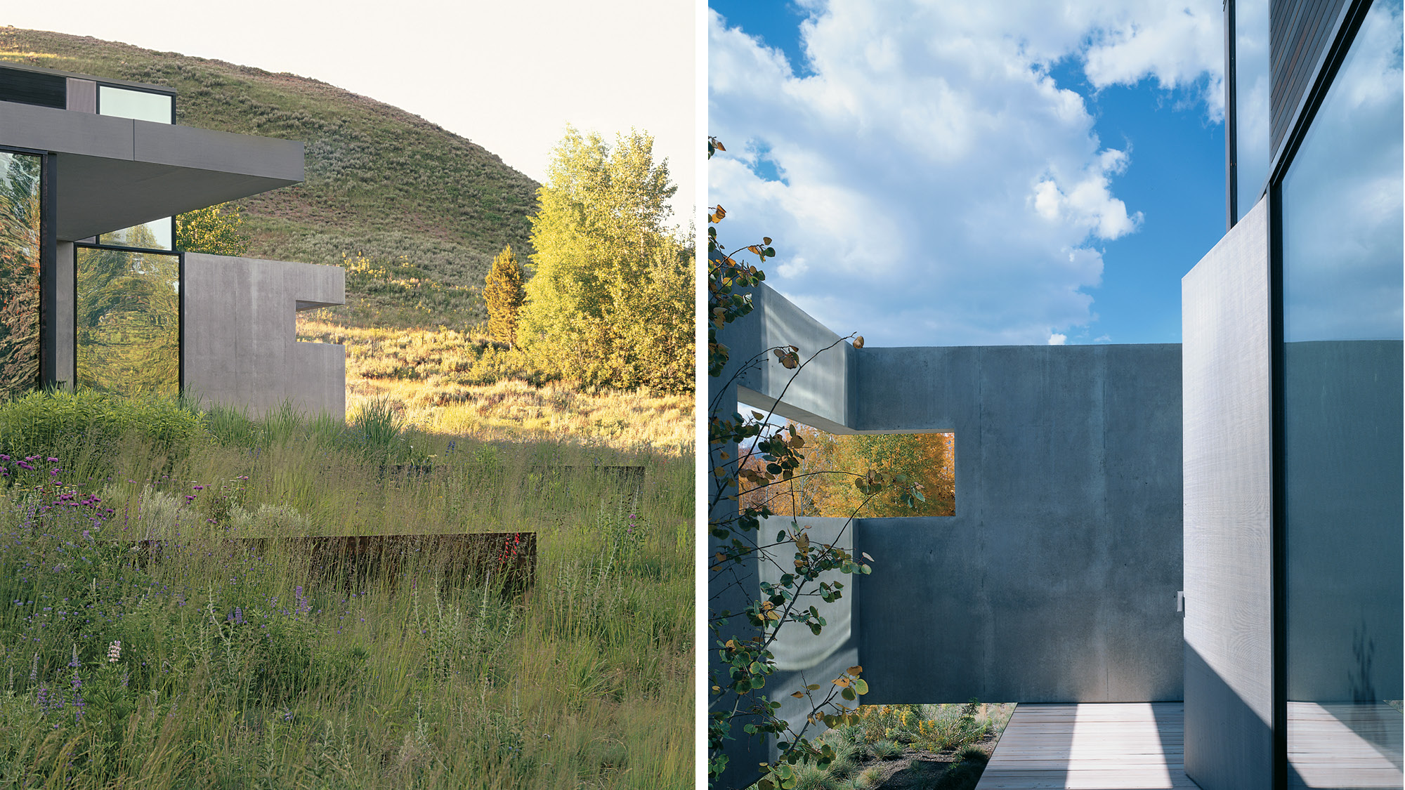 The Sun Valley Residence is a retreat for a San Francisco-based arts patron and her extended family, located in on the edge of Penny Hill, among sage pastures and aspen trees on the outskirts of Ketchum, Idaho. The family asked for a contemporary house that would nestle into the landscape. The residence is equally a comfortable home, a refuge from the elements, and a beautifully carved frame for experiencing nature, both up close and outward to the surrounding Sawtooth Range.
