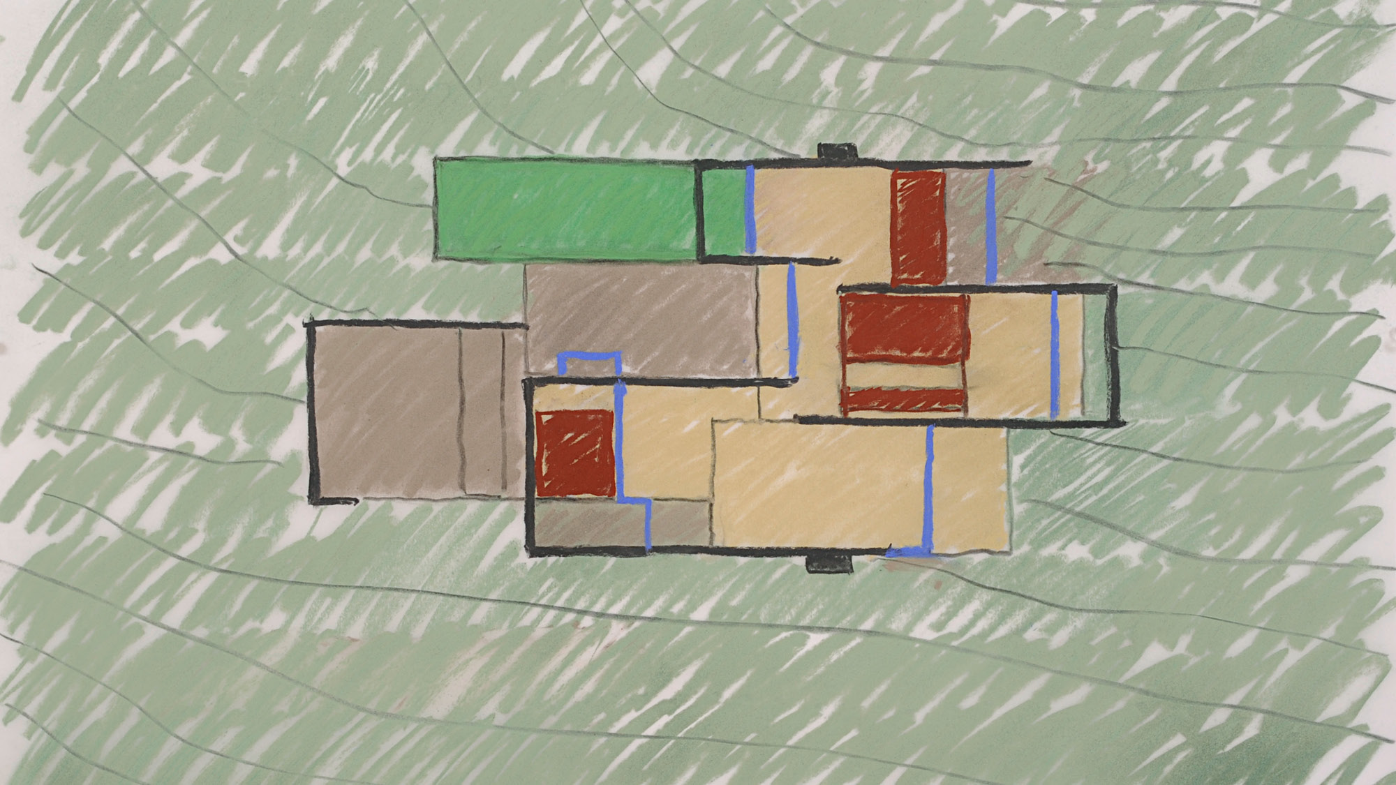 Built of meandering, site-cast concrete walls, the residence takes advantage of the land's gentle slope and open views while providing screening from the street and adjacent properties. Offering privacy and connection, these walls frame glimpses of the surrounding terrain and slip seamlessly from interior to exterior, defining terraces and secluded garden courts. The house centers on the rituals of gathering and entertaining. Kitchen, hearth, dining and living rooms join into one continuous volume that opens to a landscape of native plantings and commissioned artworks. A separate suite of rooms provides a more intimate scale for rest and personal reflection.