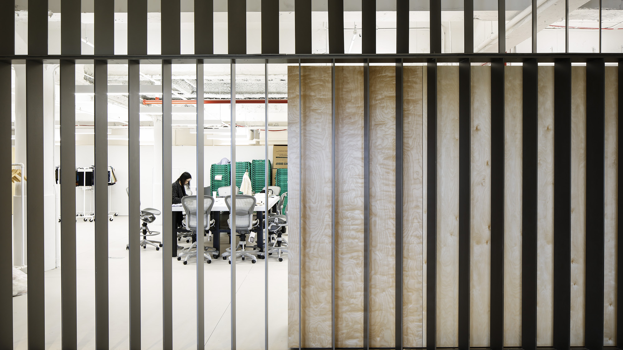 A multi-level interior street and cascading stair connects each department and project team to shared resources and informal meeting spaces. Each brand maintains their own identity and control over their process. Within this framework, new ideas are discussed, sketched, fabricated, modeled and marketed within a few steps, and all team members are given new opportunities for interaction—streamlining the production process in a way that speaks to an earlier era in fashion. The proximity and energy allows for unhindered creative development. Within, a bright, simple palette of white plaster, pale wood and brushed aluminum screens provides an ideal stage to take ideas from the drawing board to the showroom floor.