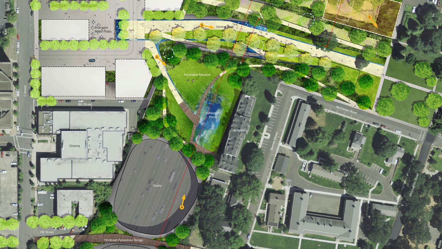 The Vancouver Community Connector is a 14-acre urban park and freeway cap in Vancouver, Washington, just north of the Columbia River. The Connector will unite the city’s downtown with the Fort Vancouver Historic Reserve. In the process, it will reclaim ground lost in the reconstruction and expansion of Interstate 5.